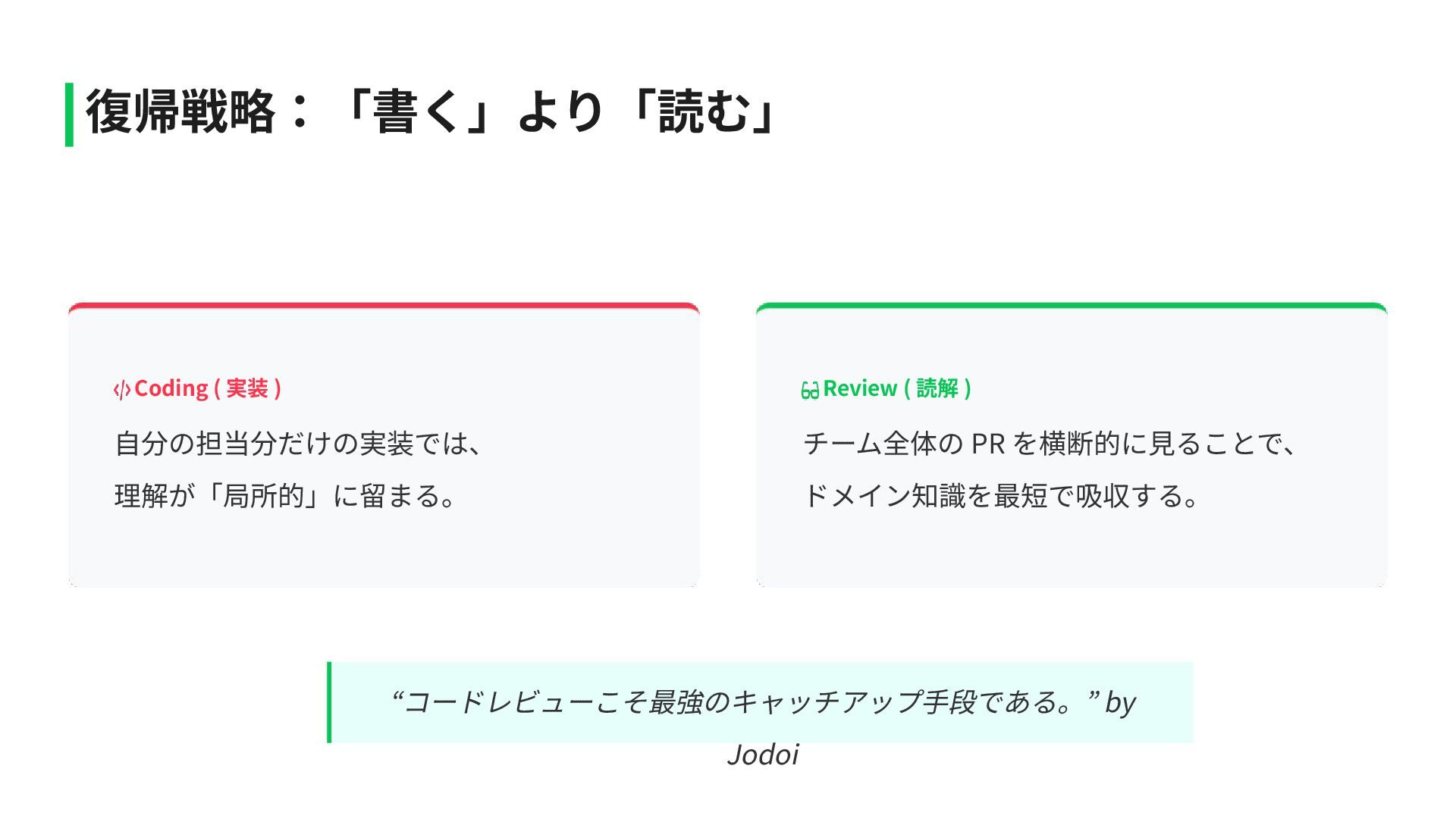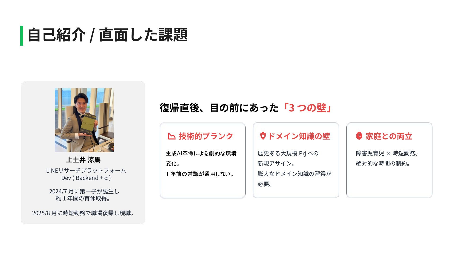 1年間の育休から時短勤務で復帰する中、技術的ブランク・ドメイン知識不足・時間制約という「3つの壁」に直面。