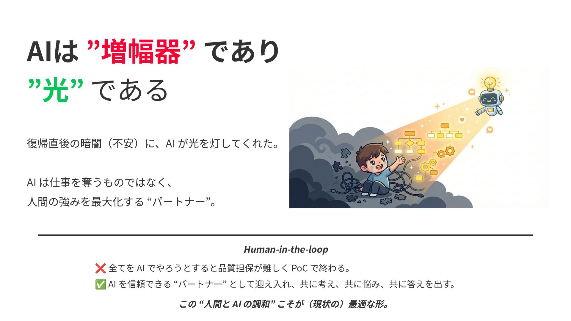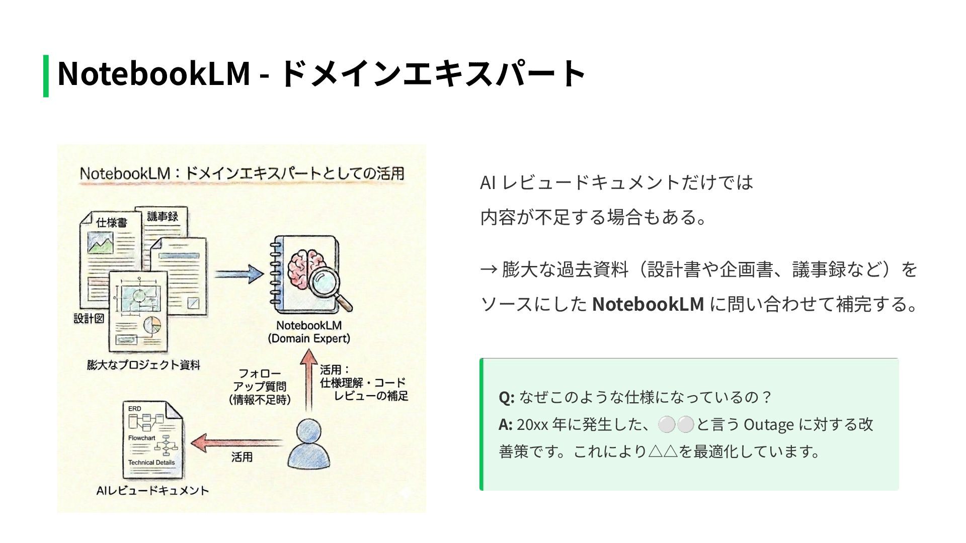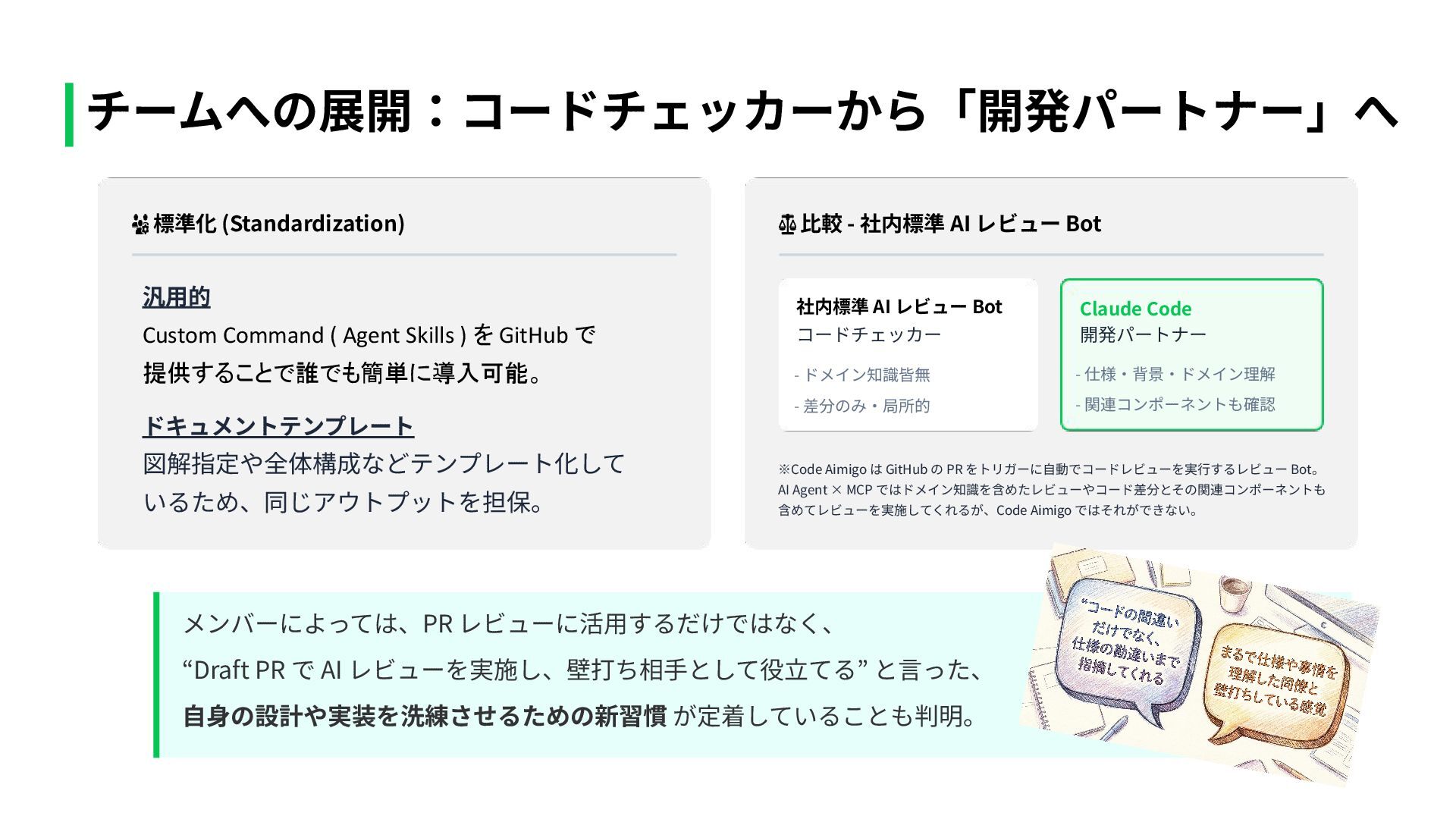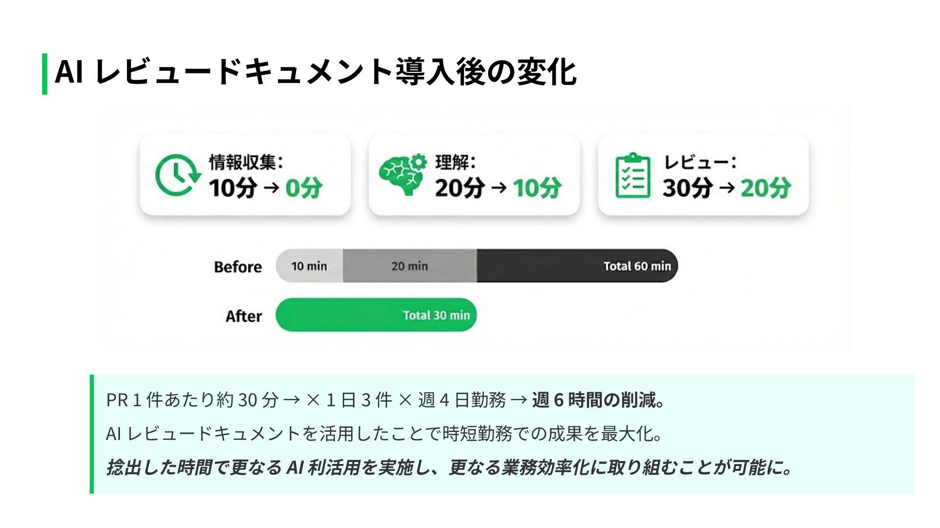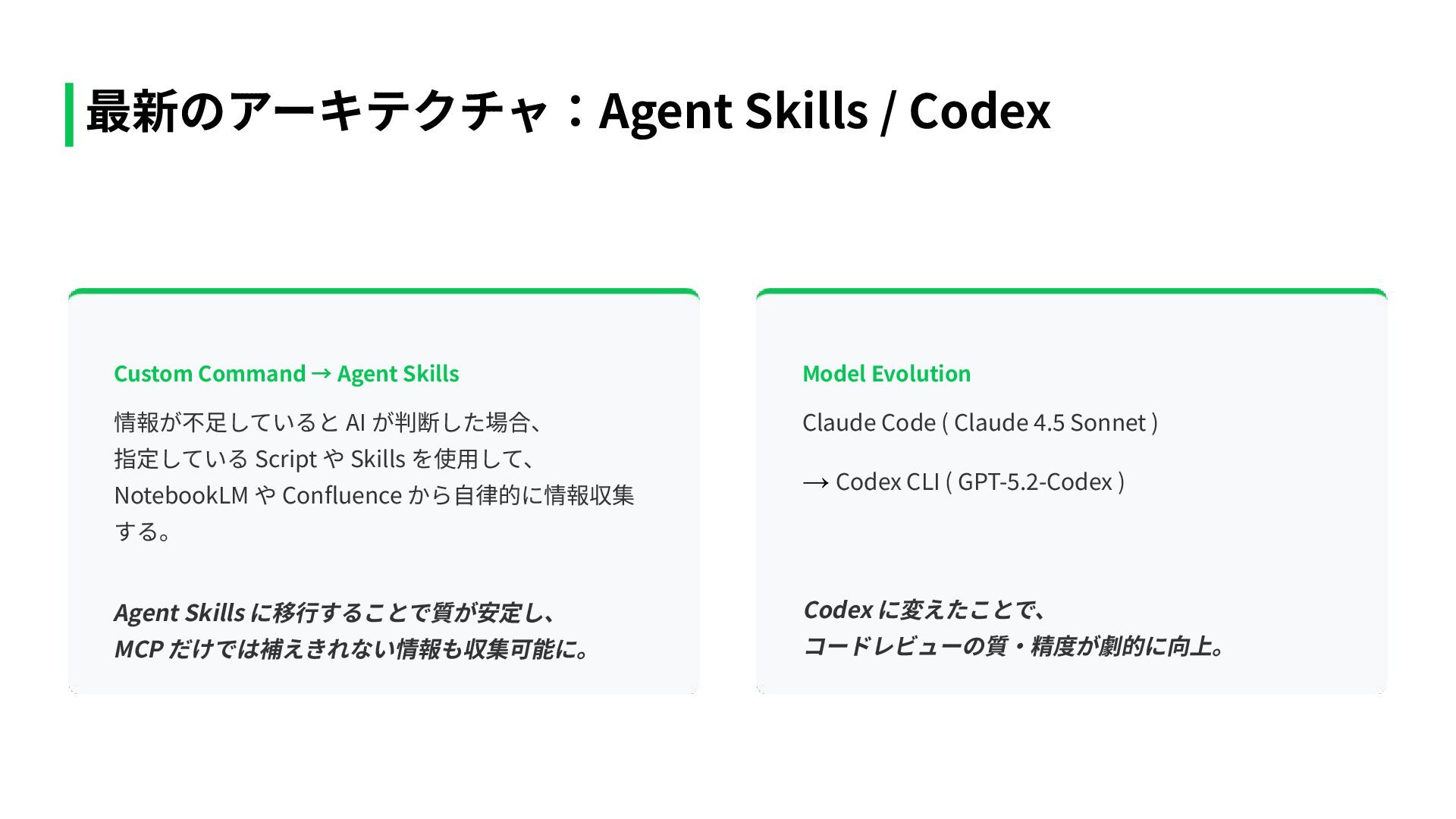 Claude Code × MCP から Agent Skills / Codex へと進化させたAI活用により、レビュー品質を高めながら週6時間を創出した実践事例を紹介。
