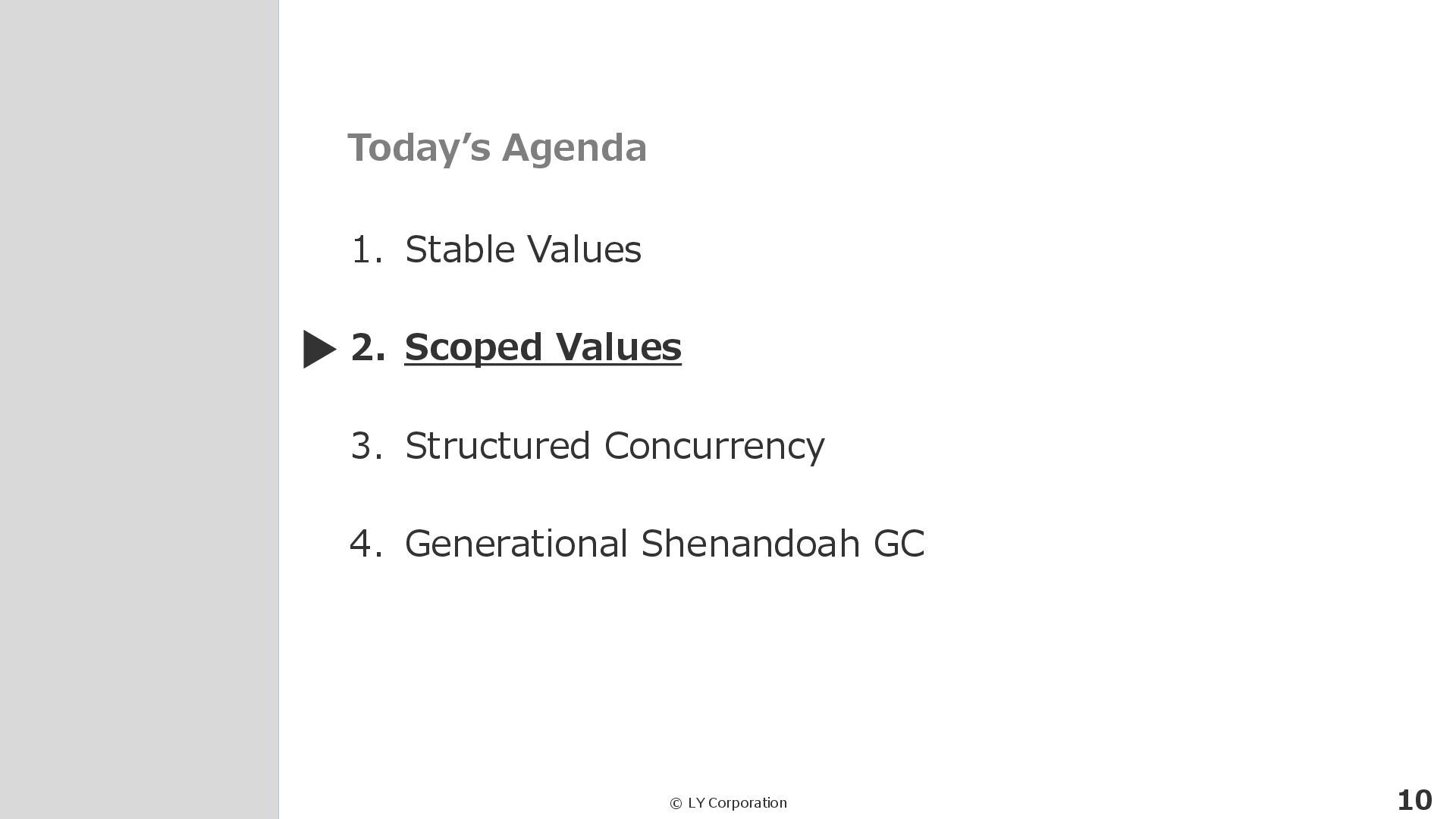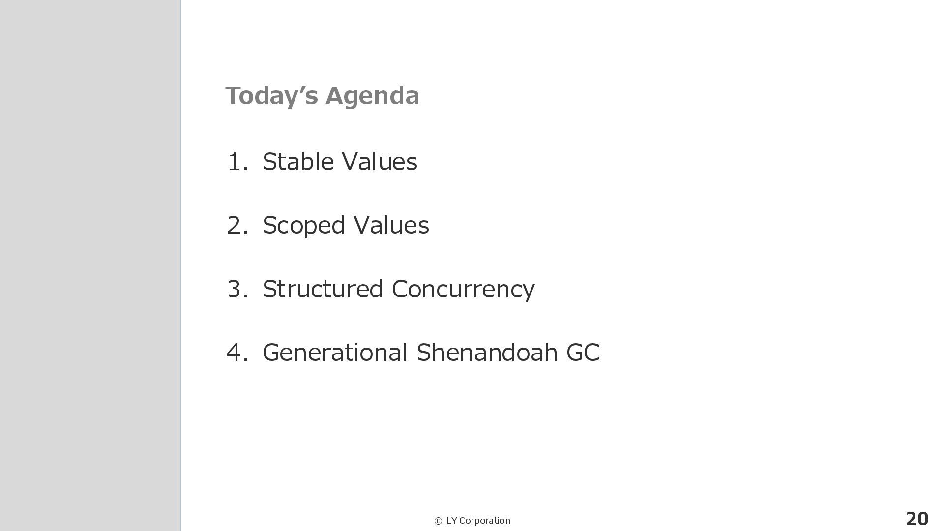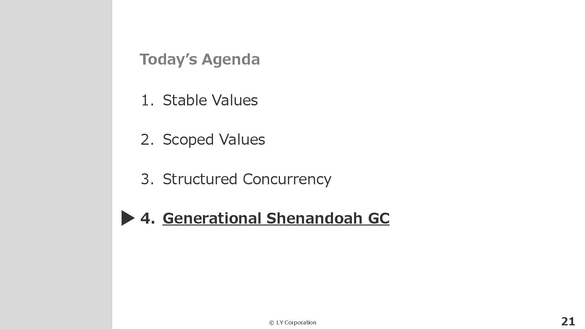 Scoped Values: 特定のスコープに不変な値を渡すことができる ⚫ Structured Concurrency: 並行処理するタスクを構造化できる ⚫ Generational Shenandoah GC: Shenandoah GCに世代別を追加