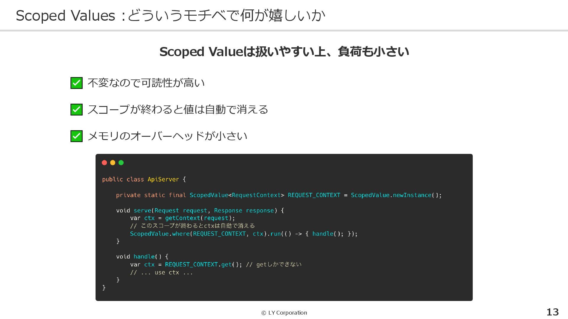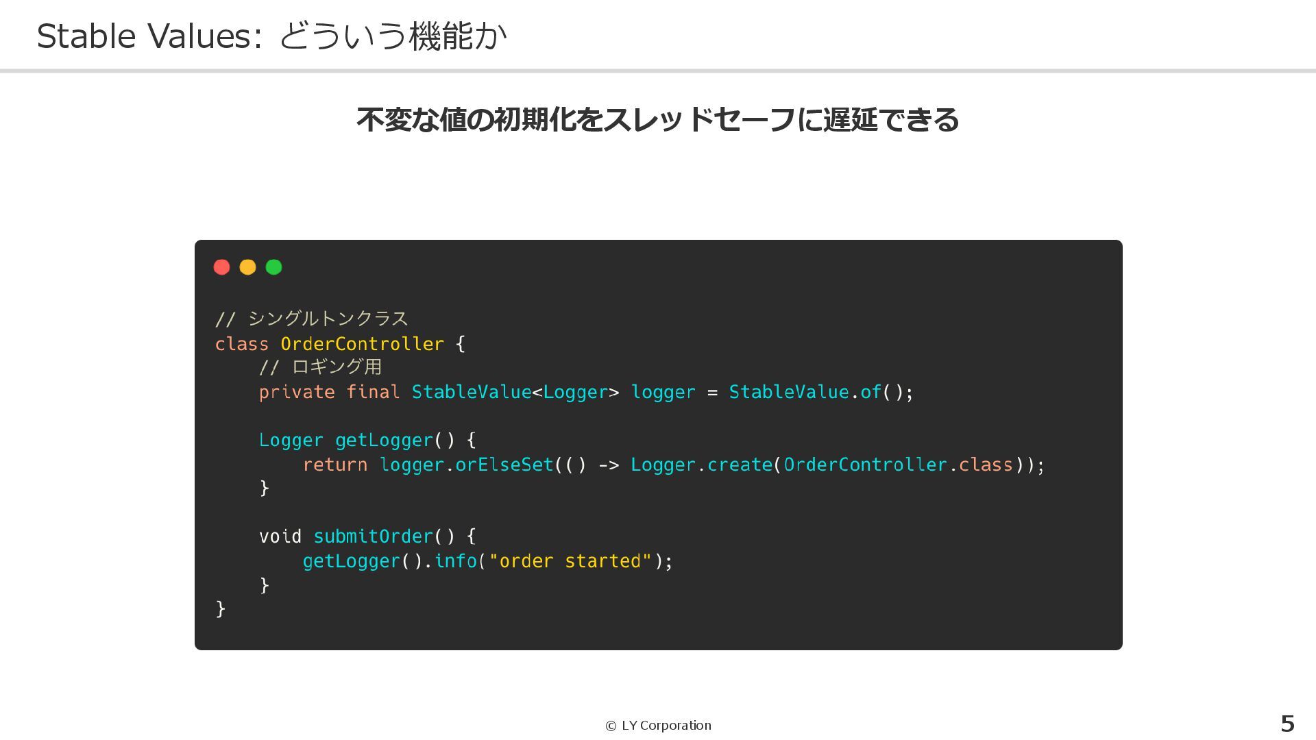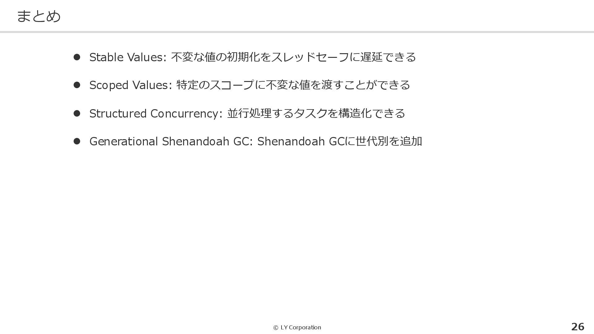 13. まとめ © LY Corporation 26 ⚫ Stable Values: 不変な値の初期化をスレッドセーフに遅延できる ⚫