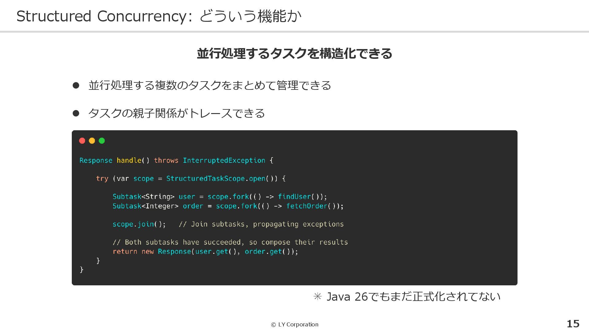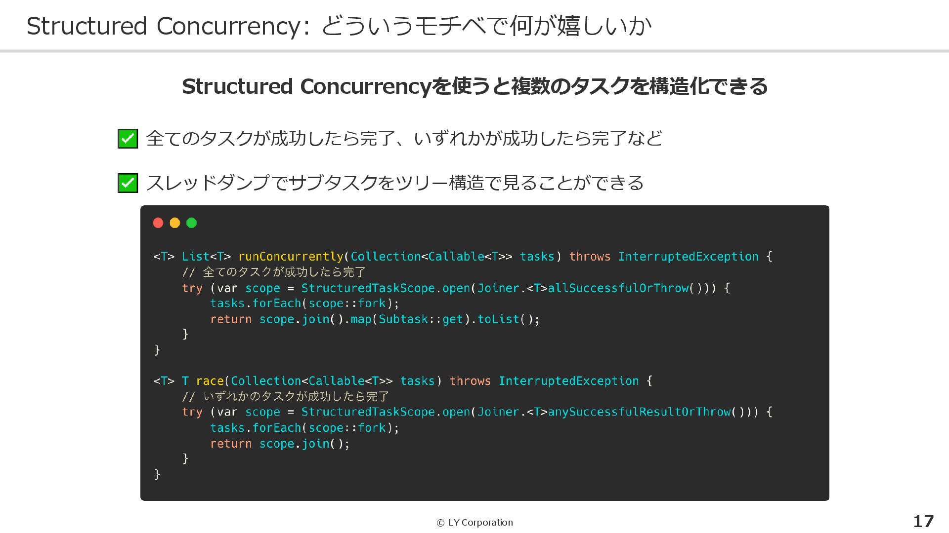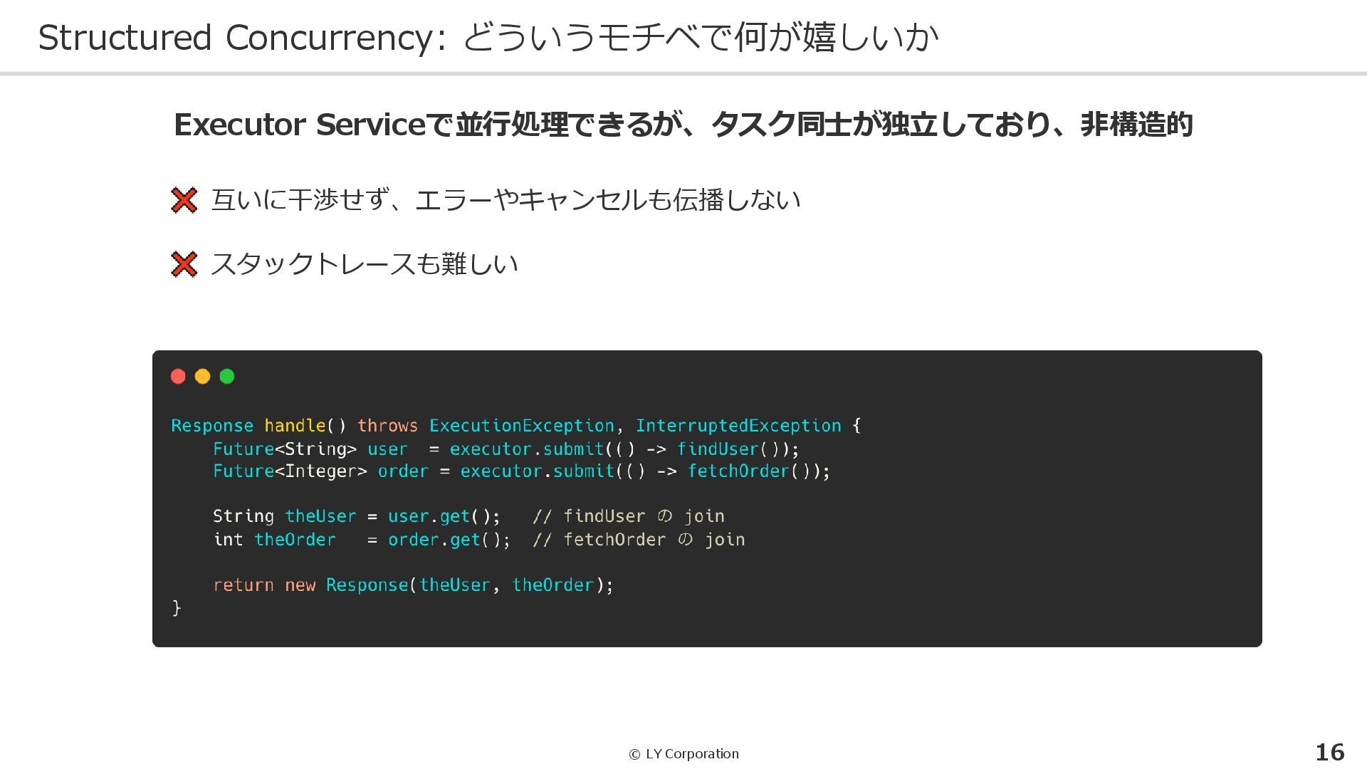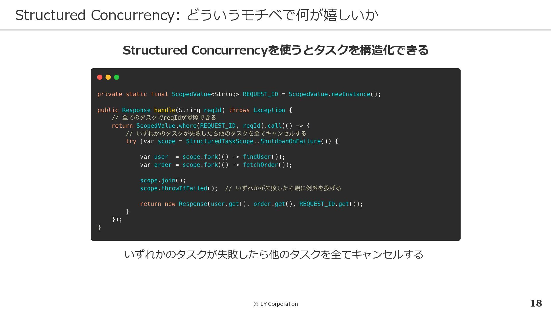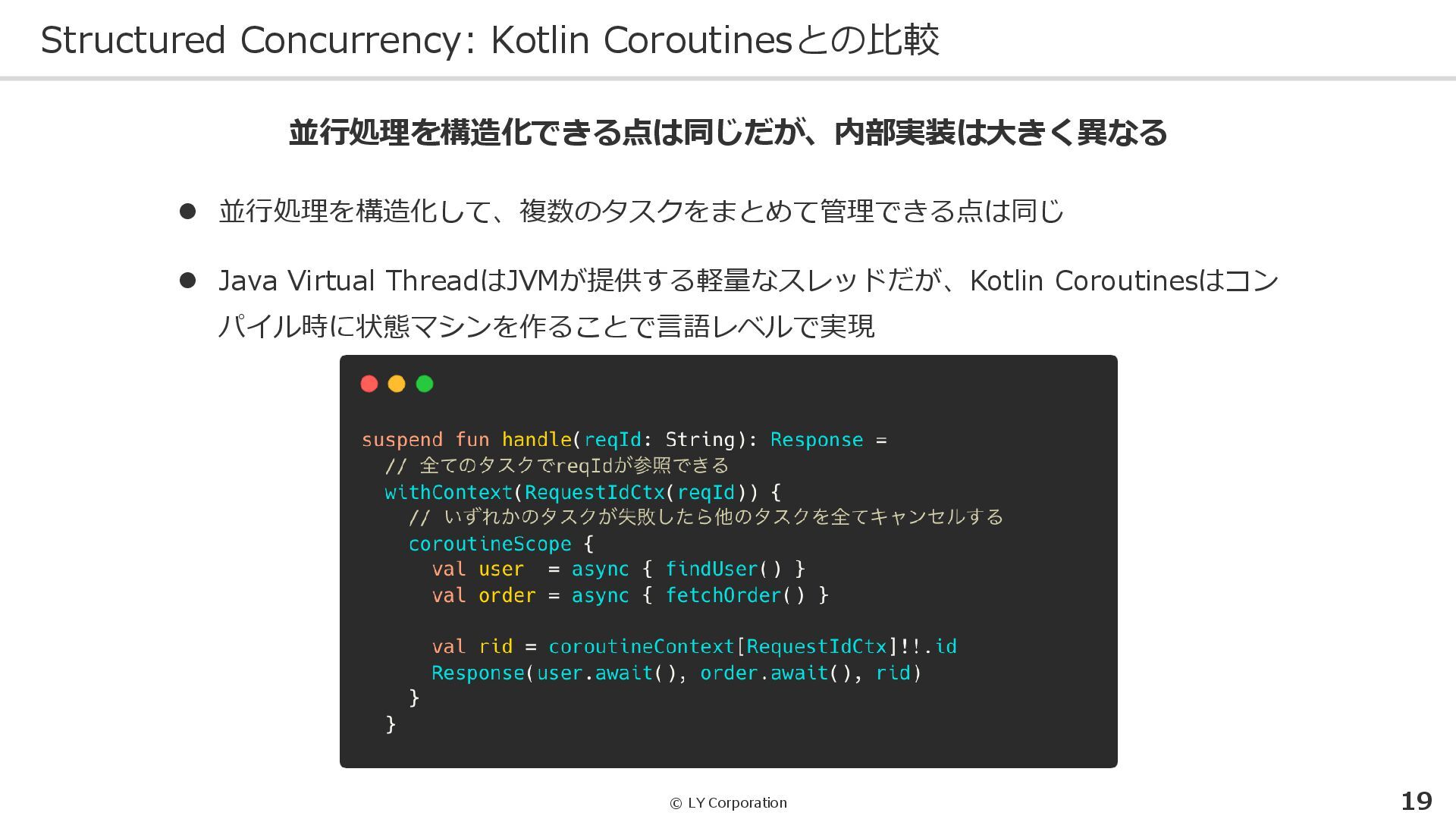 7. Structured Concurrency: Kotlin Coroutinesとの比較 © LY Corporation 19 並行処理を構造化できる点は同じだが、内部実装は大きく異なる ⚫