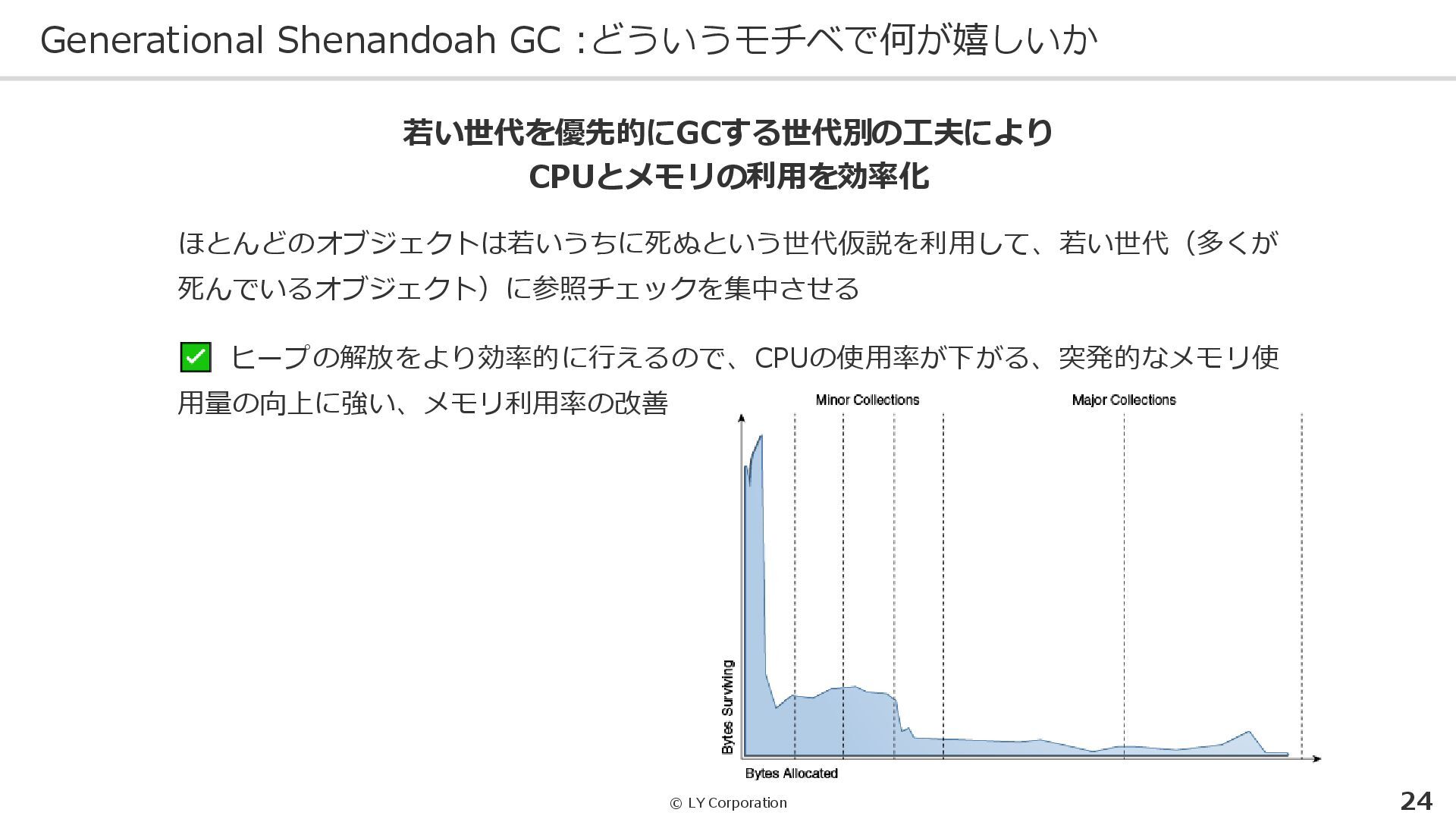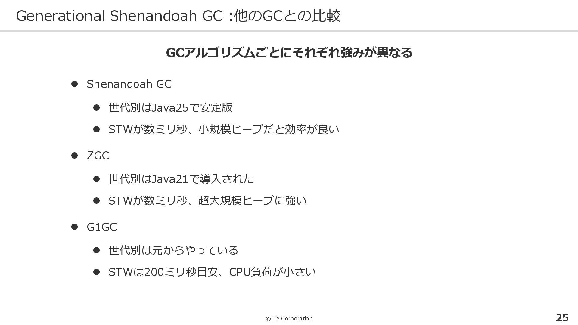 11. Generational Shenandoah GC :どういうモチベで何が嬉しいか © LY Corporation 24 ほとんどのオブジェクトは若いうちに死ぬという世代仮説を利用して、若い世代(多くが 死んでいるオブジェクト)に参照チェックを集中させる