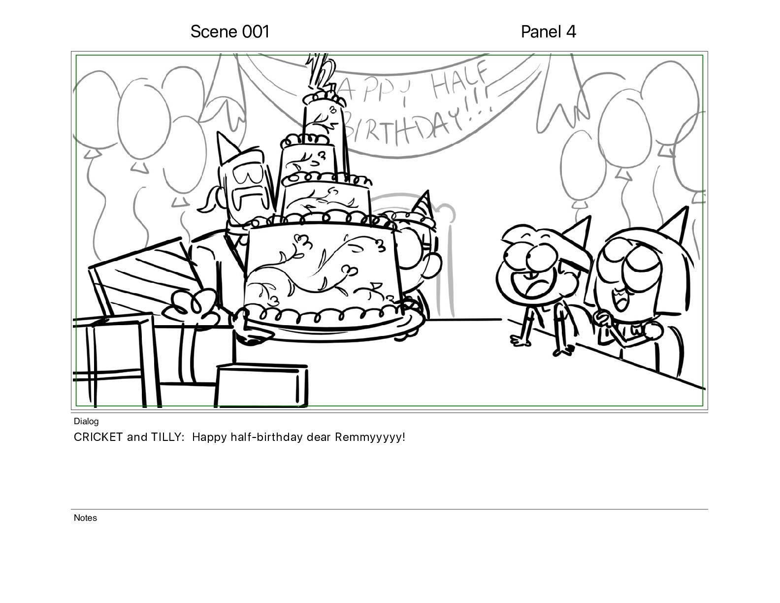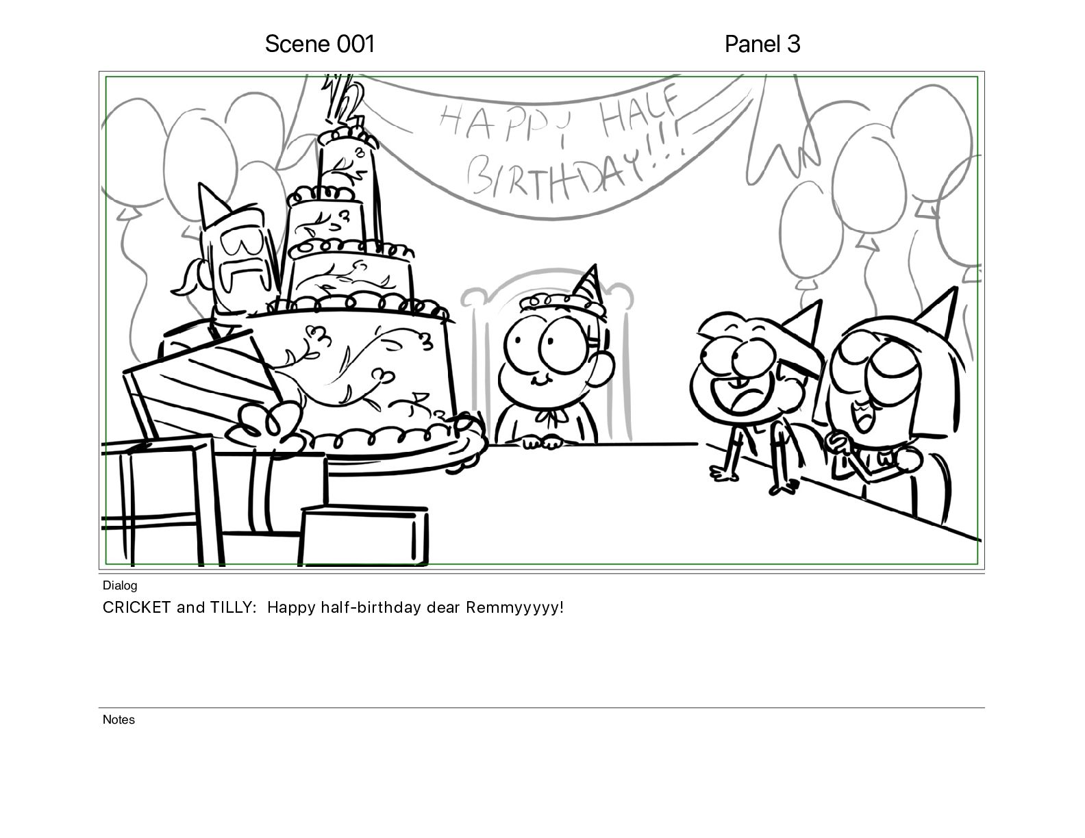 Scene 001 Panel 3 Dialog CRICKET and TILLY: Happy half-birthday