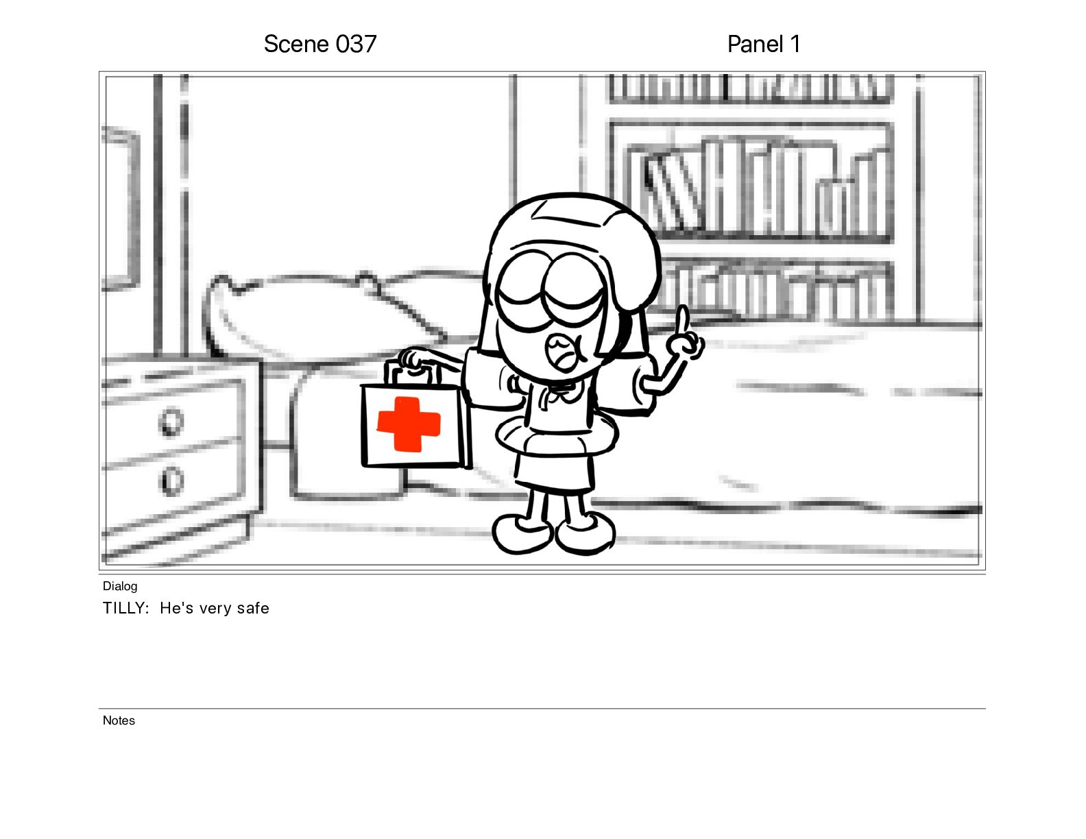 Scene 037 Panel 1 Dialog TILLY: He's very safe Notes