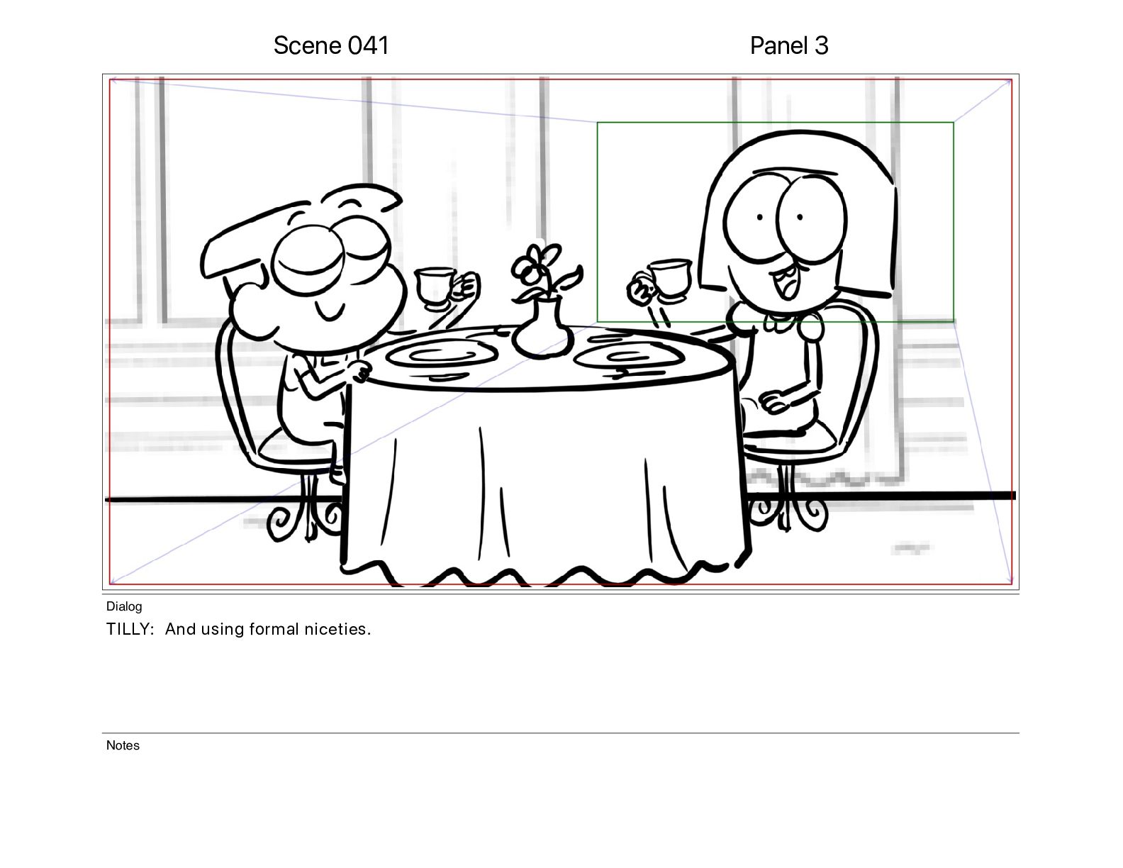 Scene 041 Panel 3 Dialog TILLY: And using formal niceties.