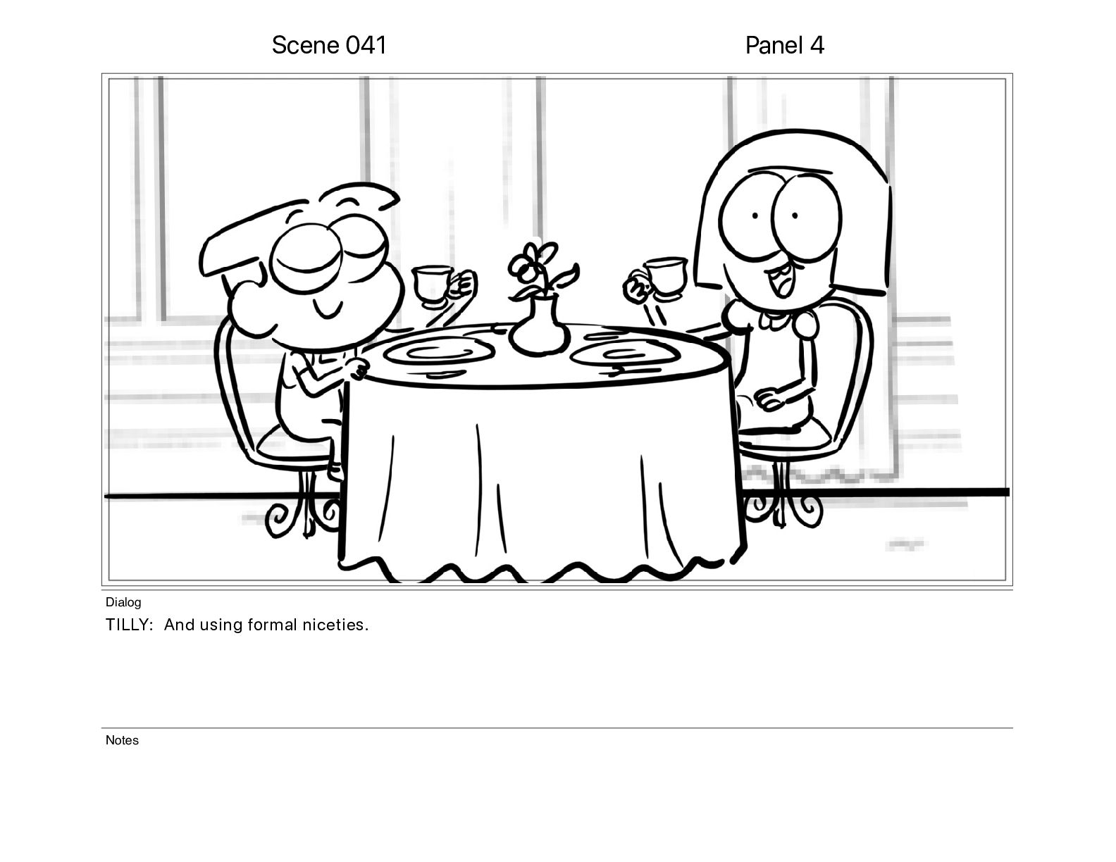 Scene 041 Panel 5 Dialog TILLY: And using formal niceties.