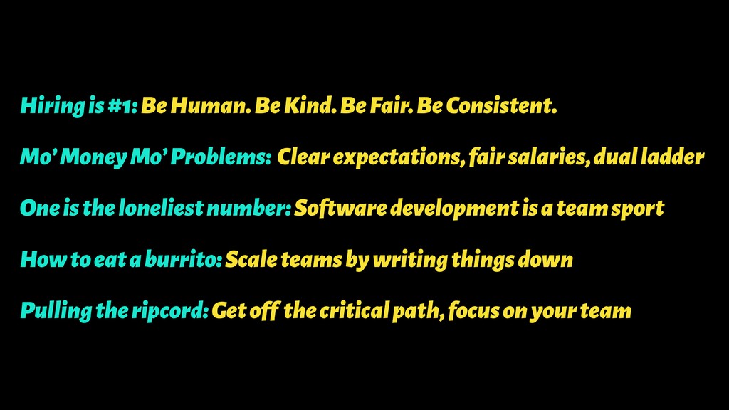Every person is an individual and every team is unique. There is no secret sauce or set formula to follow when trying to build a successful team. You need to forge your own path and build your own culture, but you can learn a lot about approaches to try, and pitfalls to avoid, from the experiences of those who have spent time on the wild rollercoaster ride that is scaling a fast-growing software engineering team.