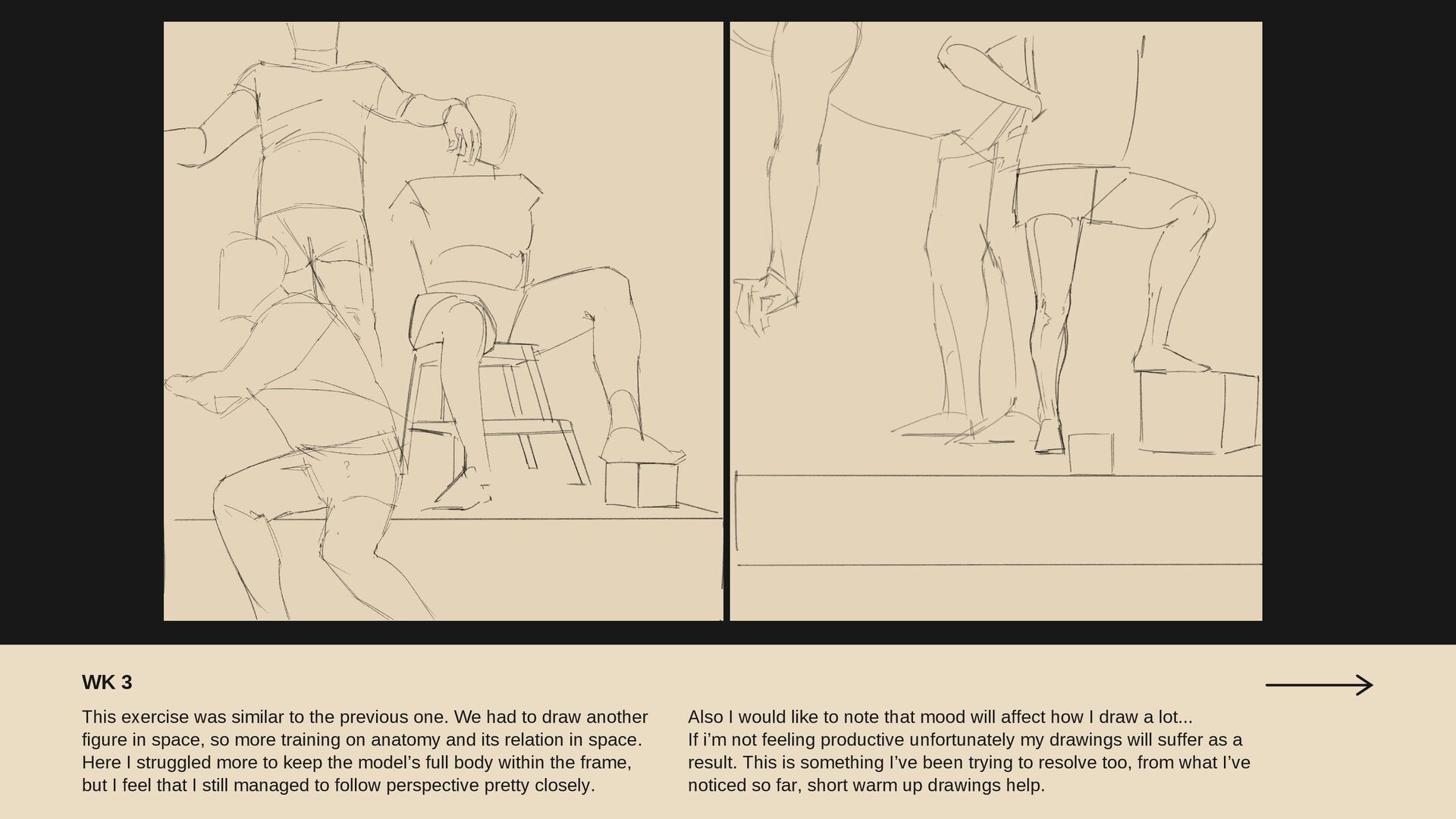 to draw another figure in space, so more training on anatomy and its relation in space. Here I struggled more to keep the model’s full body within the frame, but I feel that I still managed to follow perspective pretty closely. WK 3 Also I would like to note that mood will affect how I draw a lot... If i’m not feeling productive unfortunately my drawings will suffer as a result. This is something I’ve been trying to resolve too, from what I’ve noticed so far, short warm up drawings help.
