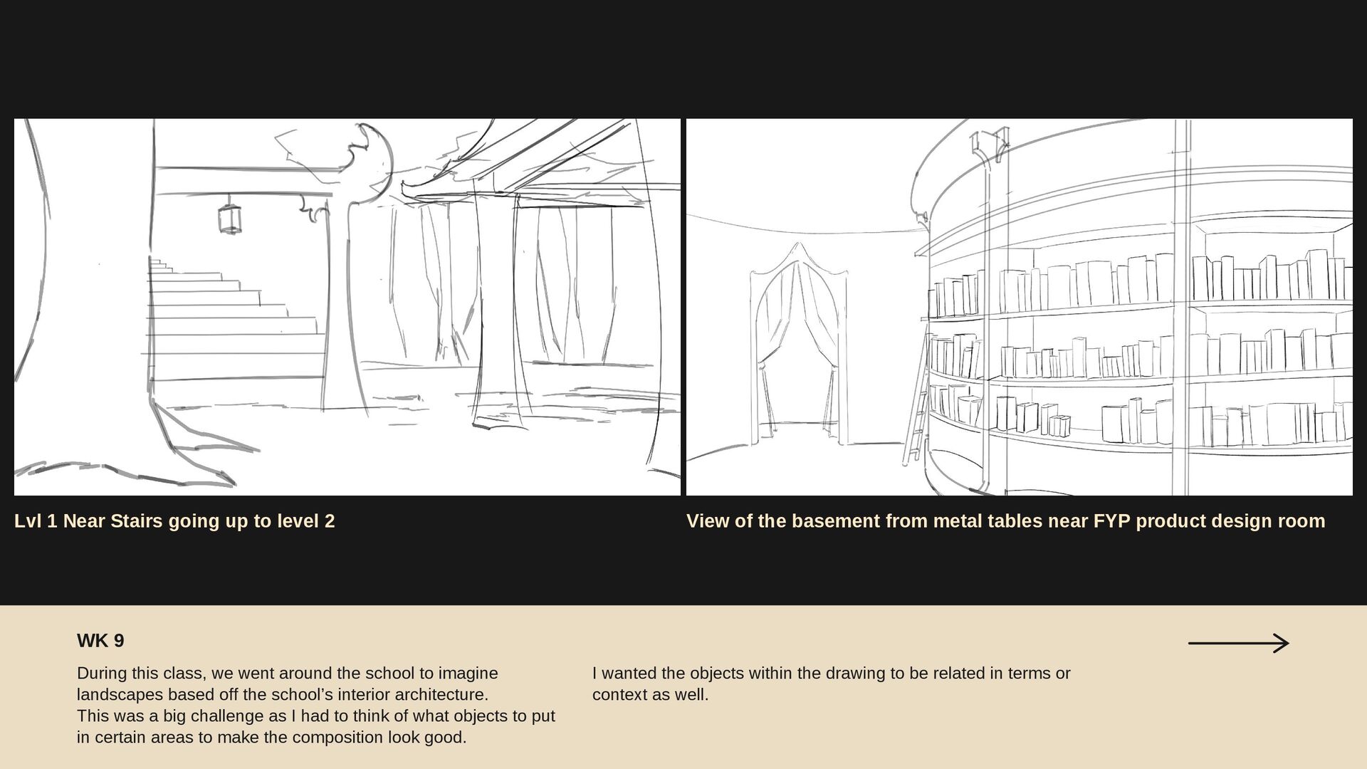 landscapes based off the school’s interior architecture. This was a big challenge as I had to think of what objects to put in certain areas to make the composition look good. WK 9 I wanted the objects within the drawing to be related in terms or context as well. Lvl 1 Near Stairs going up to level 2 View of the basement from metal tables near FYP product design room