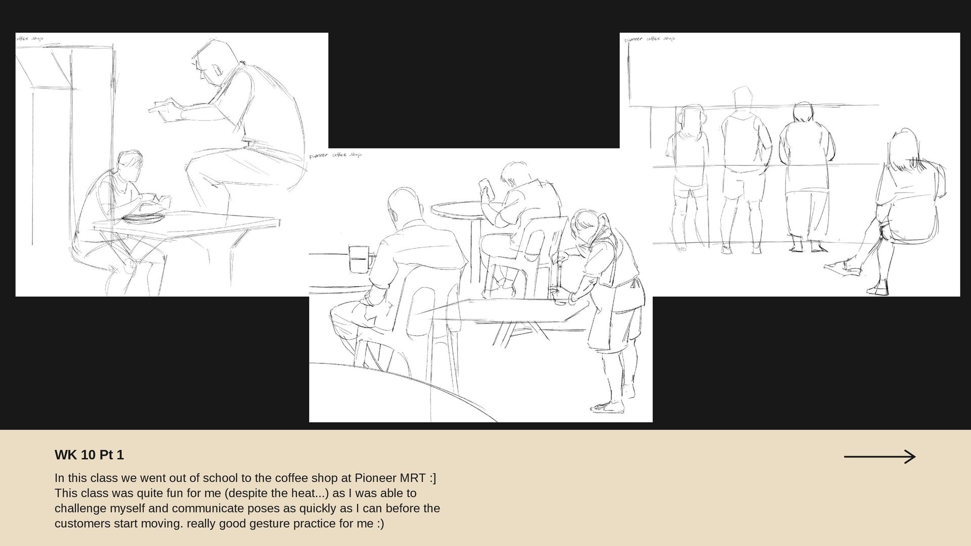 coffee shop at Pioneer MRT :] This class was quite fun for me (despite the heat...) as I was able to challenge myself and communicate poses as quickly as I can before the customers start moving. really good gesture practice for me :) WK 10 Pt 1