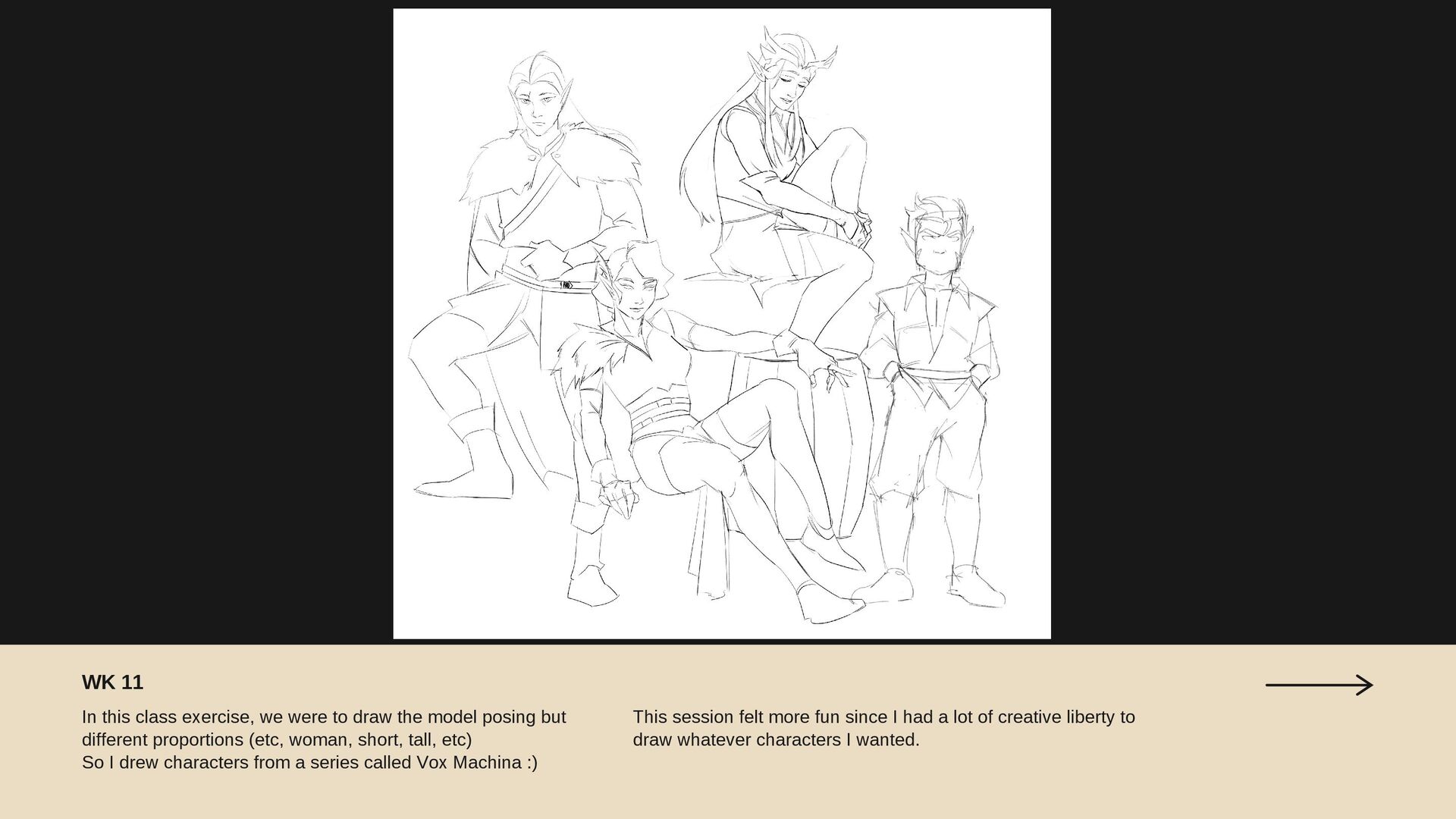 posing but different proportions (etc, woman, short, tall, etc) So I drew characters from a series called Vox Machina :) WK 11 This session felt more fun since I had a lot of creative liberty to draw whatever characters I wanted.