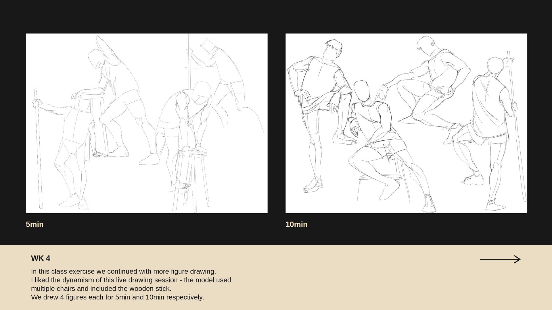 I liked the dynamism of this live drawing session - the model used multiple chairs and included the wooden stick. We drew 4 figures each for 5min and 10min respectively. WK 4 5min 10min