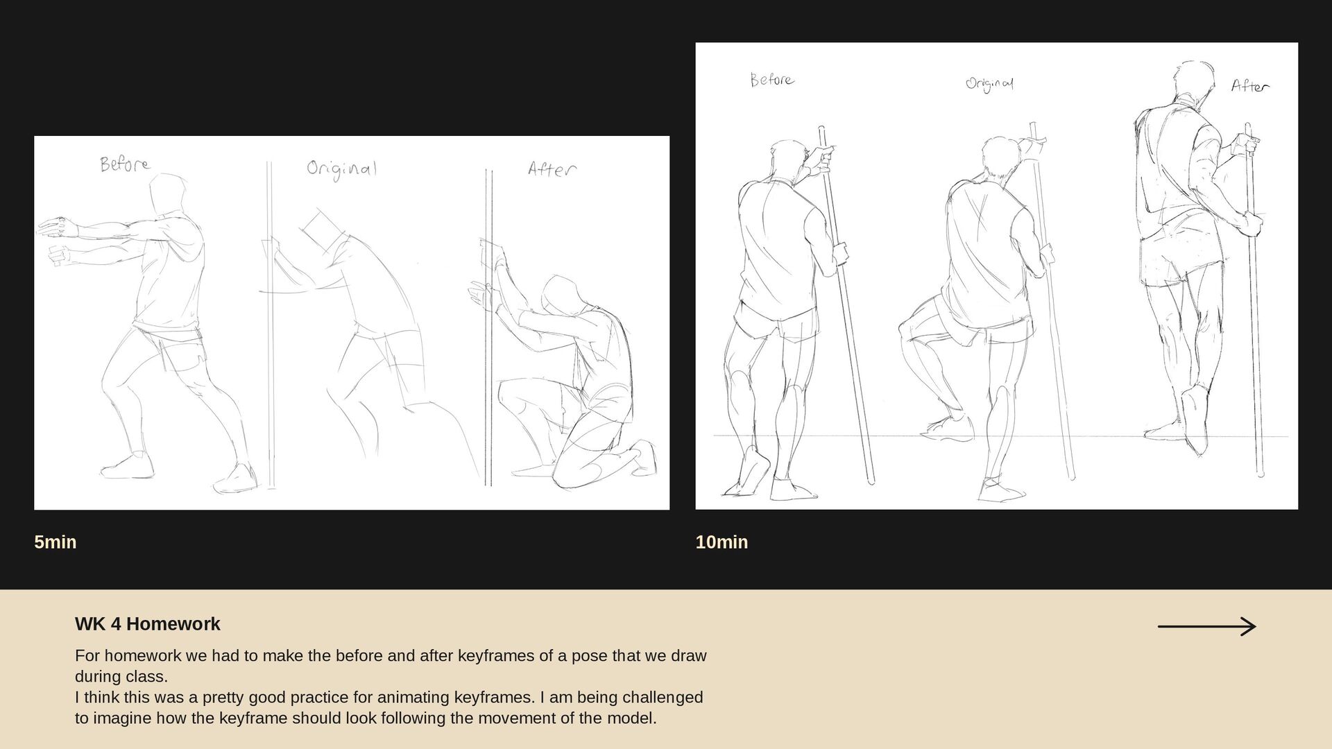 keyframes of a pose that we draw during class. I think this was a pretty good practice for animating keyframes. I am being challenged to imagine how the keyframe should look following the movement of the model. WK 4 Homework 5min 10min