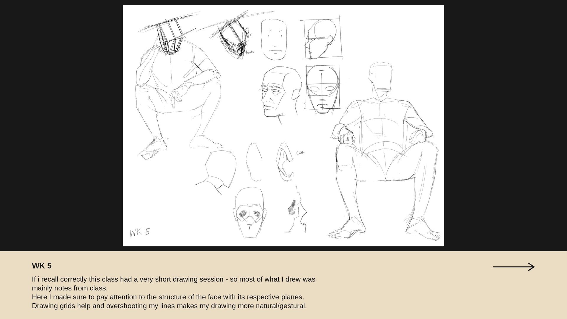 drawing session - so most of what I drew was mainly notes from class. Here I made sure to pay attention to the structure of the face with its respective planes. Drawing grids help and overshooting my lines makes my drawing more natural/gestural. WK 5