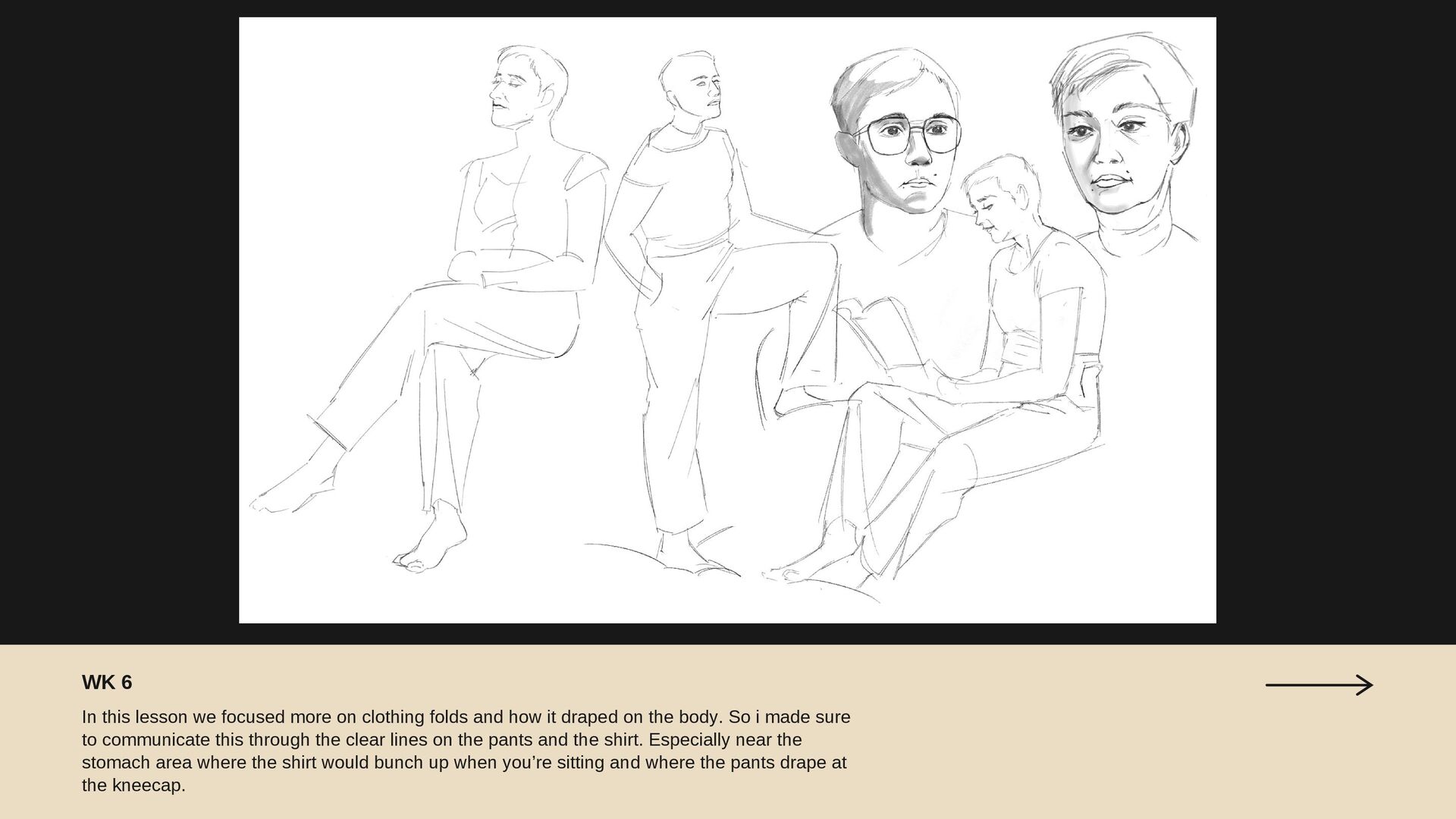 how it draped on the body. So i made sure to communicate this through the clear lines on the pants and the shirt. Especially near the stomach area where the shirt would bunch up when you’re sitting and where the pants drape at the kneecap. WK 6