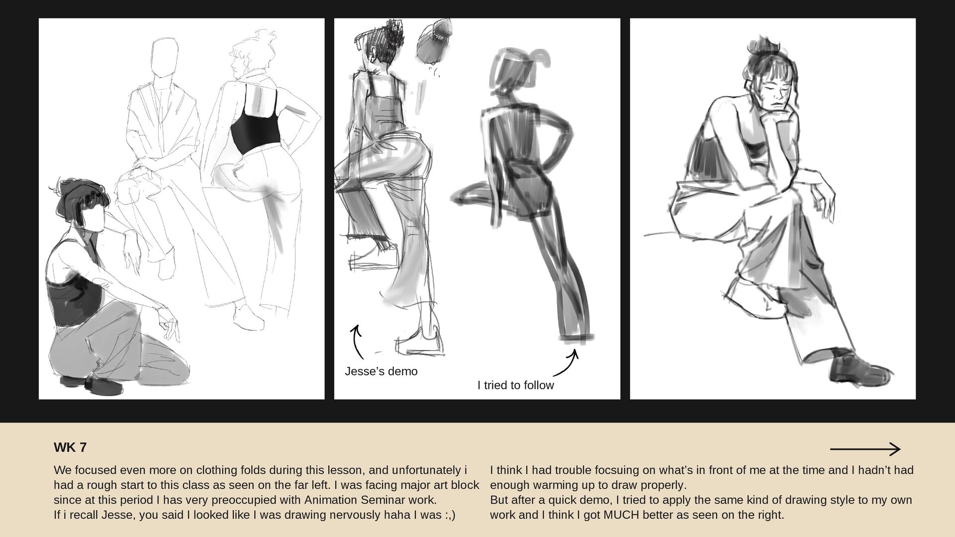 and unfortunately i had a rough start to this class as seen on the far left. I was facing major art block since at this period I has very preoccupied with Animation Seminar work. If i recall Jesse, you said I looked like I was drawing nervously haha I was :,) WK 7 I think I had trouble focsuing on what’s in front of me at the time and I hadn’t had enough warming up to draw properly. But after a quick demo, I tried to apply the same kind of drawing style to my own work and I think I got MUCH better as seen on the right. Jesse’s demo I tried to follow