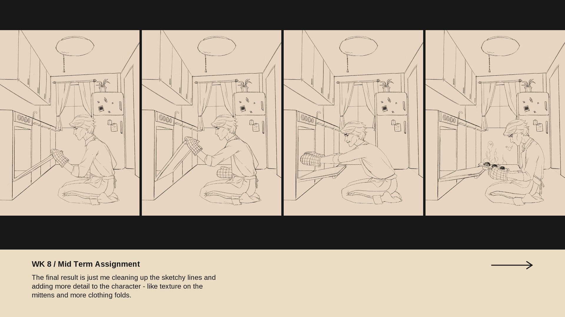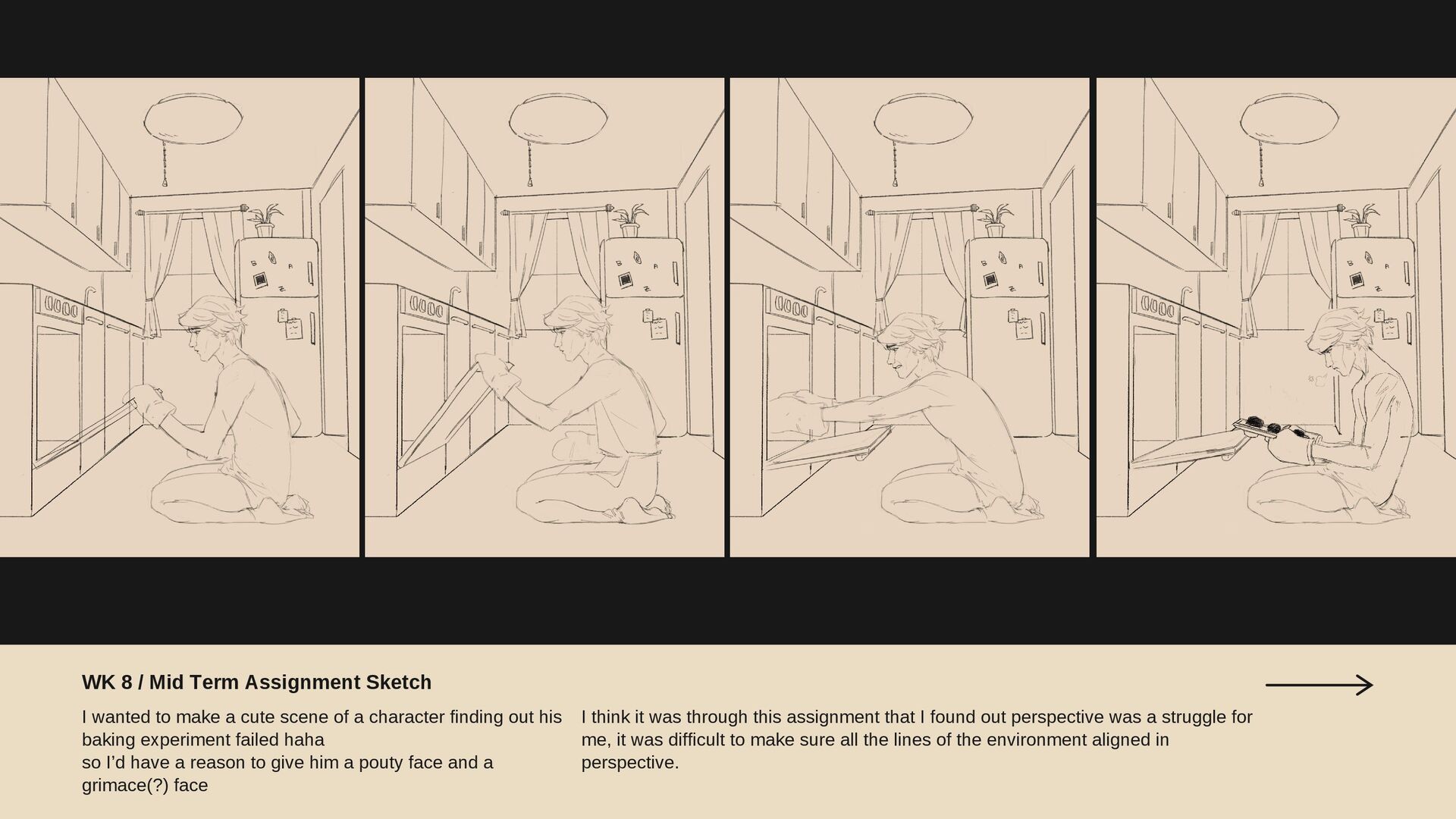 finding out his baking experiment failed haha so I’d have a reason to give him a pouty face and a grimace(?) face WK 8 / Mid Term Assignment Sketch I think it was through this assignment that I found out perspective was a struggle for me, it was difficult to make sure all the lines of the environment aligned in perspective.