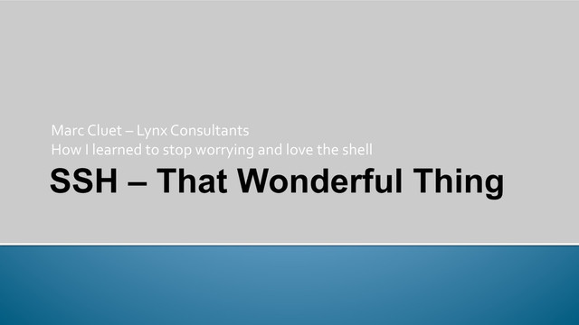 network protocol for secure data communication, remote shell services or command execution and other secure network services between two networked computers that it connects via a secure channel over an insecure network: a server and a client (running SSH server and SSH client programs, respectively).[1] The protocol specification distinguishes two major versions that are referred to as SSH-‐1 and SSH-‐2…. *whew* Lynx Consultants © 2013