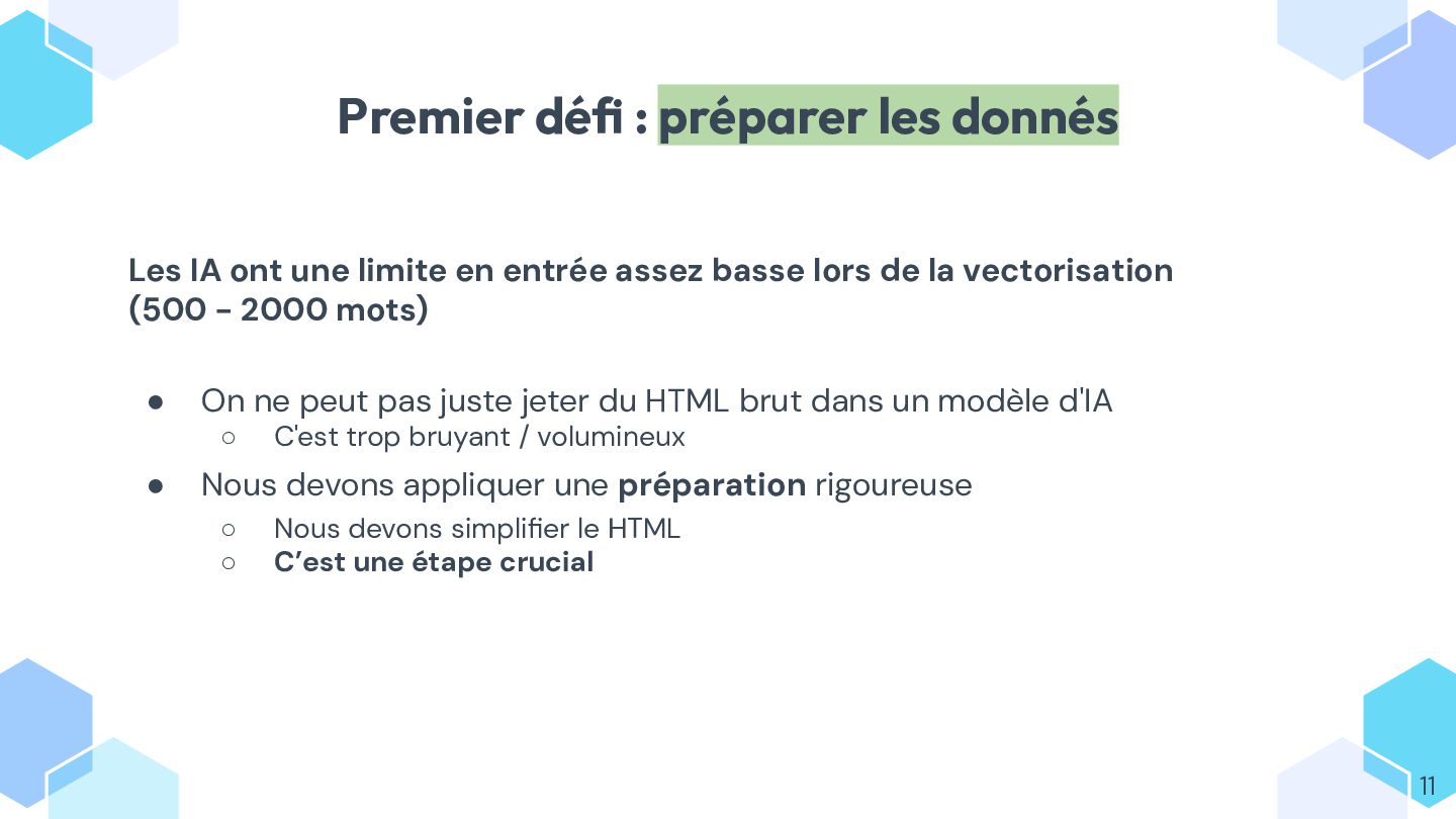 limite en entrée assez basse lors de la vectorisation (500 - 2000 mots) • On ne peut pas juste jeter du HTML brut dans un modèle d'IA ◦ C'est trop bruyant / volumineux • Nous devons appliquer une préparation rigoureuse ◦ Nous devons simplifier le HTML ◦ C’est une étape crucial 11