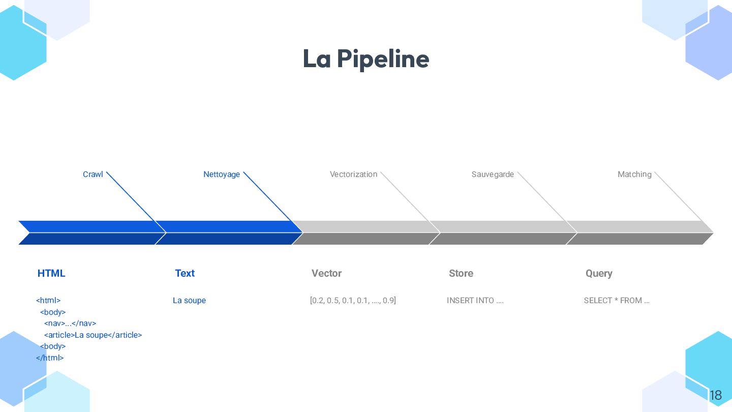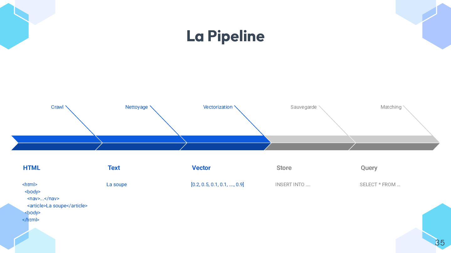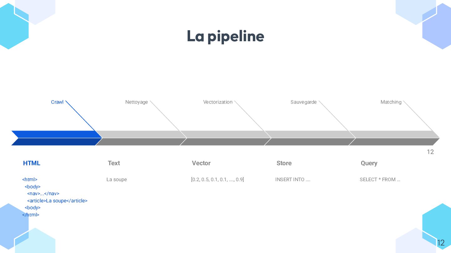 </html> Nettoyage Text La soupe Vectorization Vector [0.2, 0.5, 0.1, 0.1, …., 0.9] Sauvegarde Store INSERT INTO …. 12 Matching Query SELECT * FROM … 12