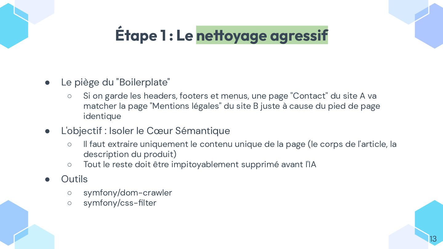 "Boilerplate" ◦ Si on garde les headers, footers et menus, une page "Contact" du site A va matcher la page "Mentions légales" du site B juste à cause du pied de page identique • L'objectif : Isoler le Cœur Sémantique ◦ Il faut extraire uniquement le contenu unique de la page (le corps de l'article, la description du produit) ◦ Tout le reste doit être impitoyablement supprimé avant l'IA • Outils ◦ symfony/dom-crawler ◦ symfony/css-filter 13