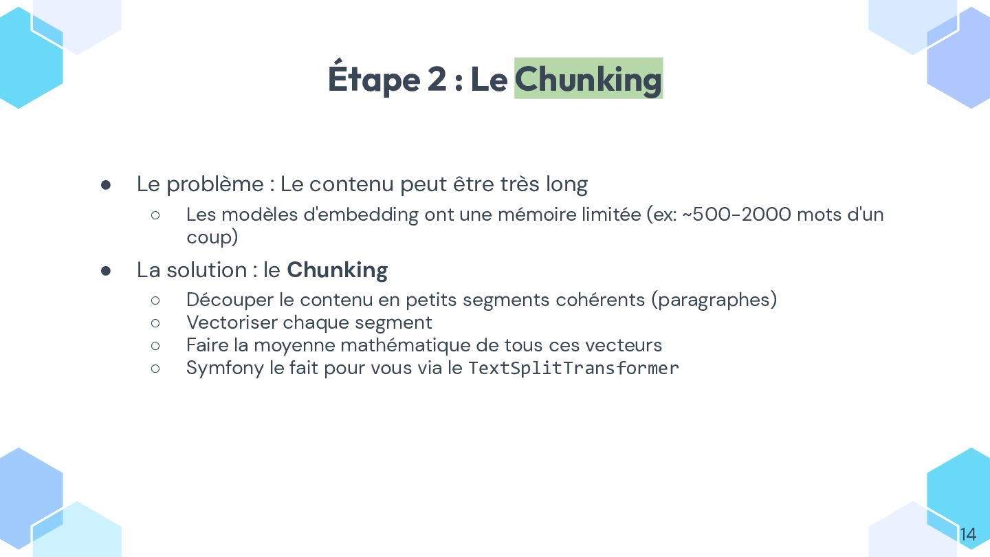 contenu peut être très long ◦ Les modèles d'embedding ont une mémoire limitée (ex: ~500-2000 mots d'un coup) • La solution : le Chunking ◦ Découper le contenu en petits segments cohérents (paragraphes) ◦ Vectoriser chaque segment ◦ Faire la moyenne mathématique de tous ces vecteurs ◦ Symfony le fait pour vous via le TextSplitTransformer 14
