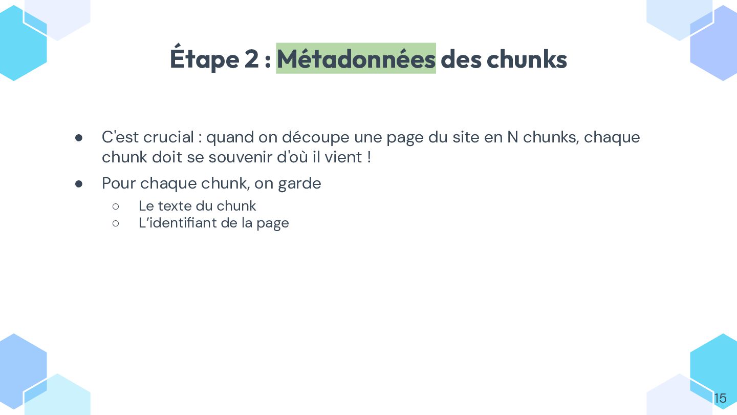 11. Étape 2 : Métadonnées des chunks • C'est crucial :