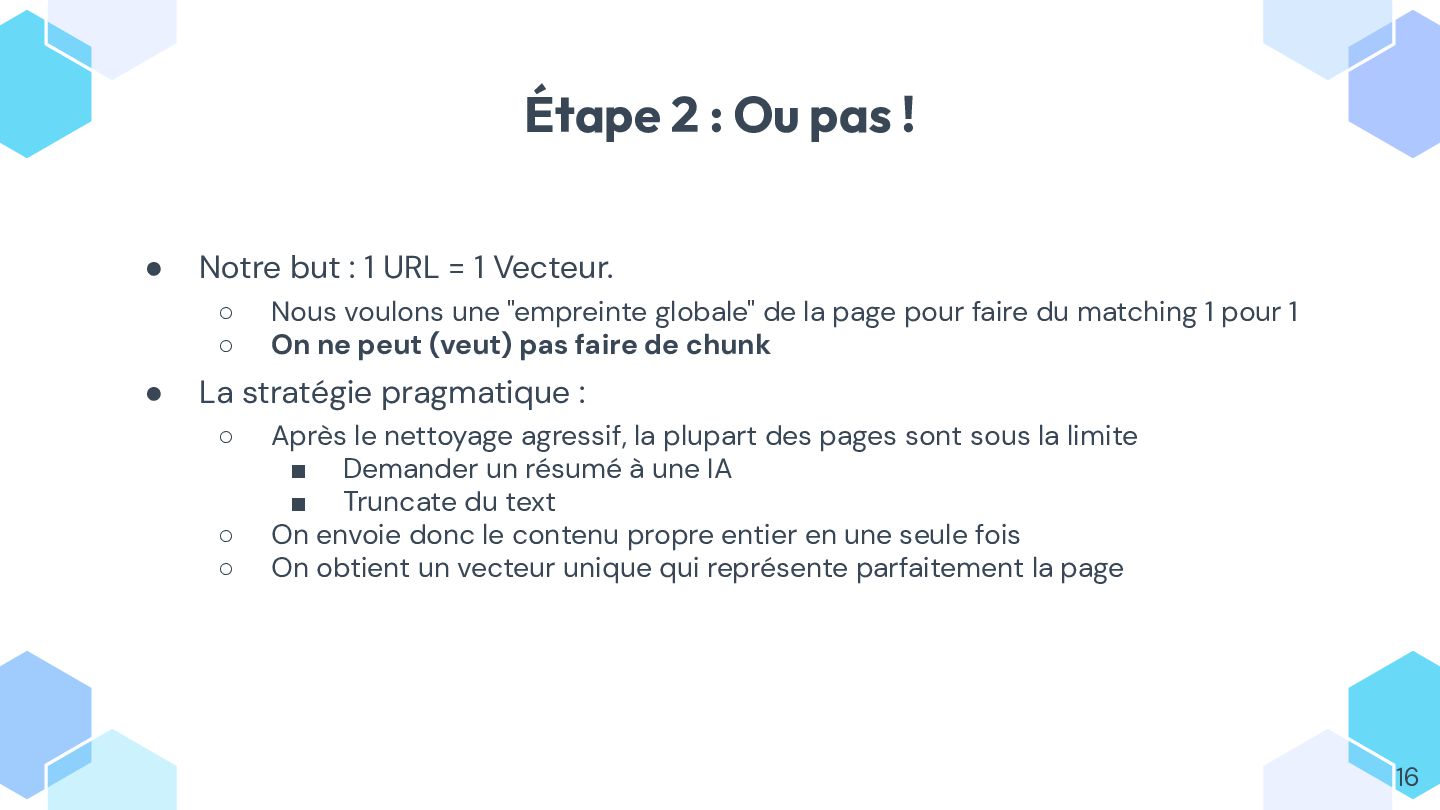 1 URL = 1 Vecteur. ◦ Nous voulons une "empreinte globale" de la page pour faire du matching 1 pour 1 ◦ On ne peut (veut) pas faire de chunk • La stratégie pragmatique : ◦ Après le nettoyage agressif, la plupart des pages sont sous la limite ▪ Demander un résumé à une IA ▪ Truncate du text ◦ On envoie donc le contenu propre entier en une seule fois ◦ On obtient un vecteur unique qui représente parfaitement la page 16