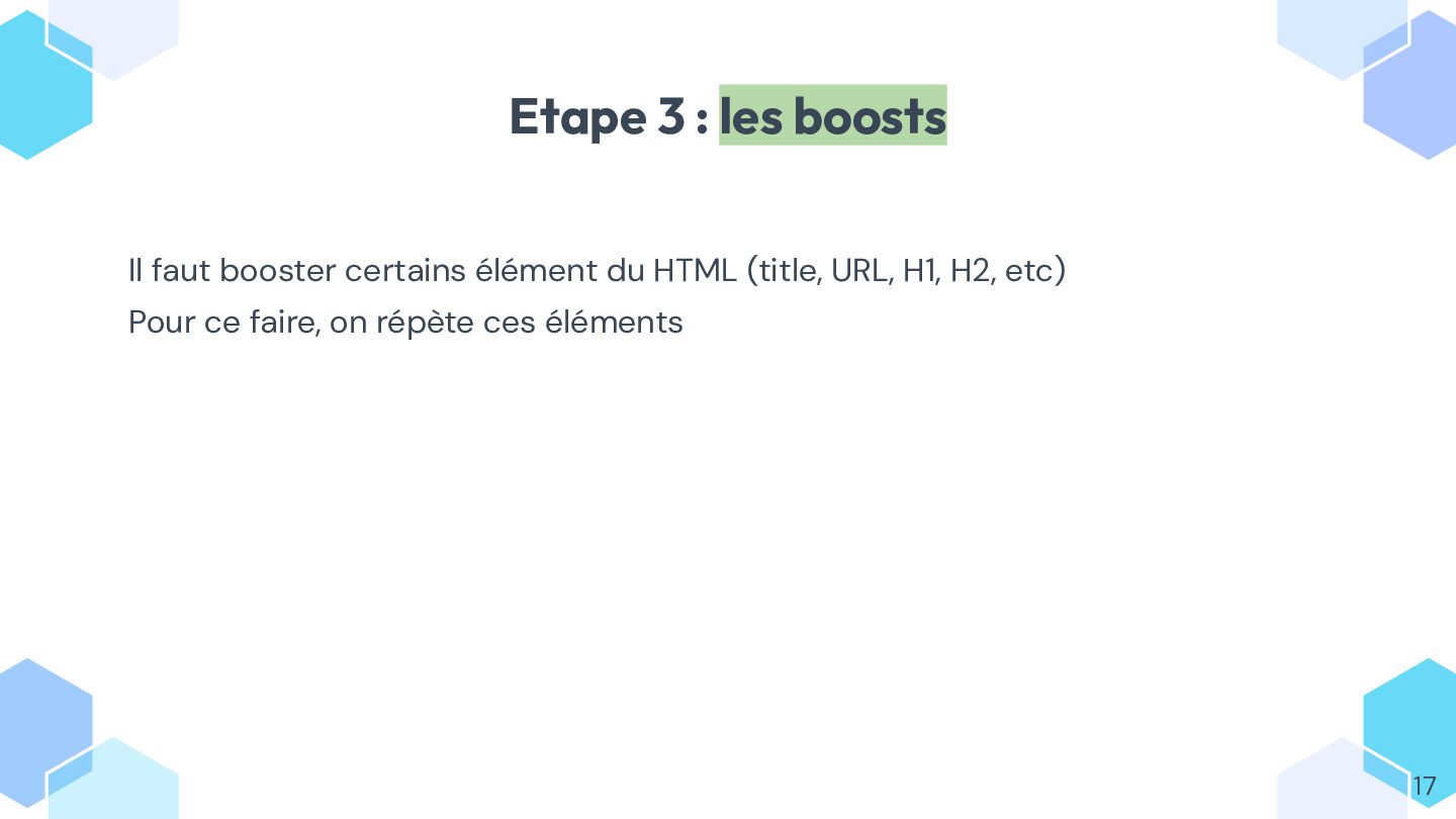 du HTML (title, URL, H1, H2, etc) Pour ce faire, on répète ces éléments 17