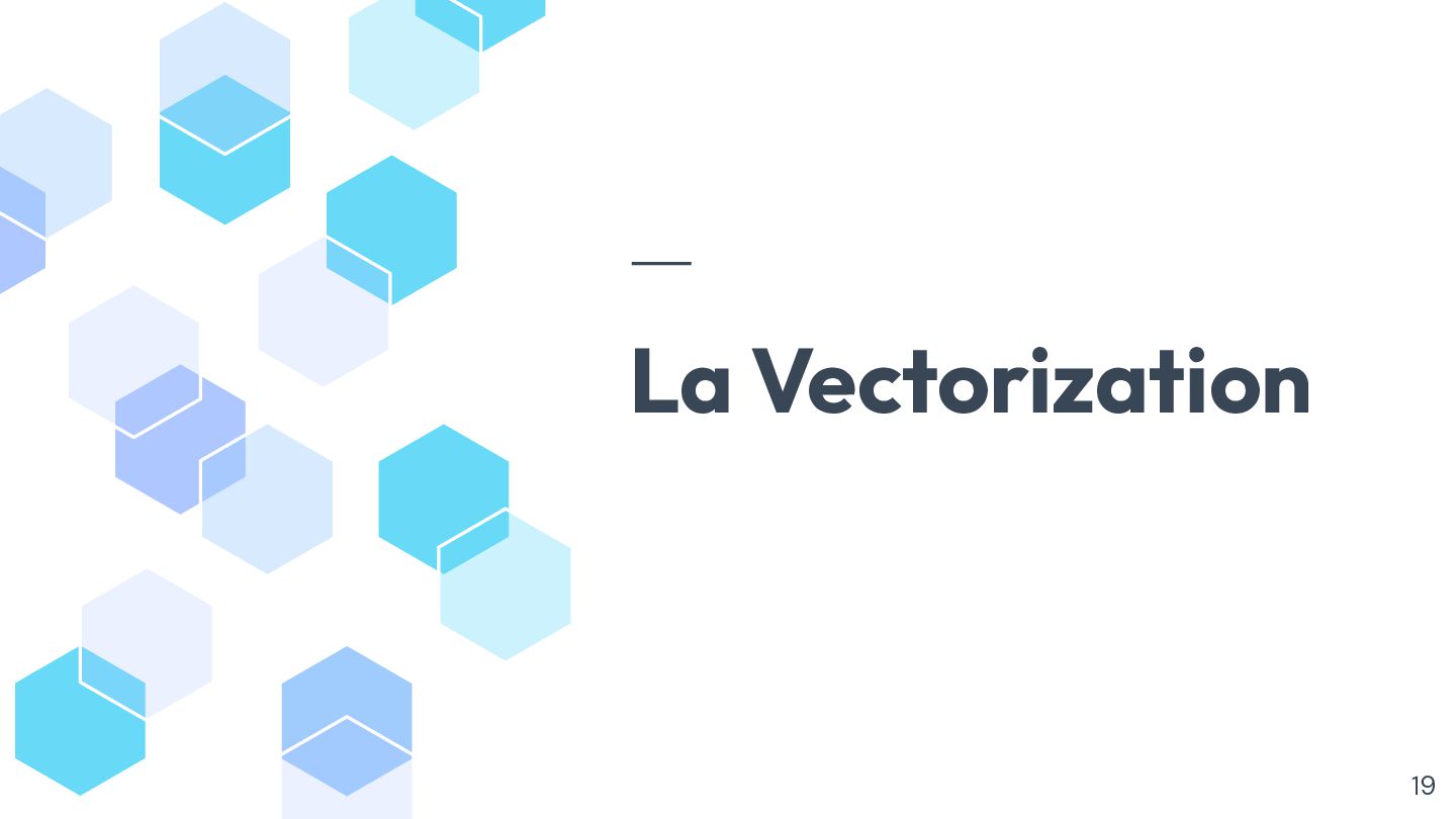 </html> Nettoyage Text La soupe Vectorization Vector [0.2, 0.5, 0.1, 0.1, …., 0.9] Sauvegarde Store INSERT INTO …. 18 Matching Query SELECT * FROM …