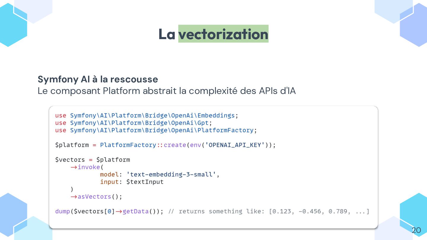 * vectoriser du contenu depuis Symfony et communiquer efficacement avec votre modèle ;