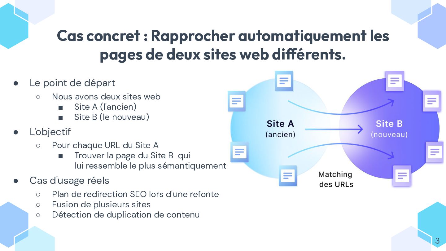 web différents. • Le point de départ ◦ Nous avons deux sites web ▪ Site A (l'ancien) ▪ Site B (le nouveau) • L'objectif ◦ Pour chaque URL du Site A ▪ Trouver la page du Site B qui lui ressemble le plus sémantiquement • Cas d'usage réels ◦ Plan de redirection SEO lors d'une refonte ◦ Fusion de plusieurs sites ◦ Détection de duplication de contenu 3