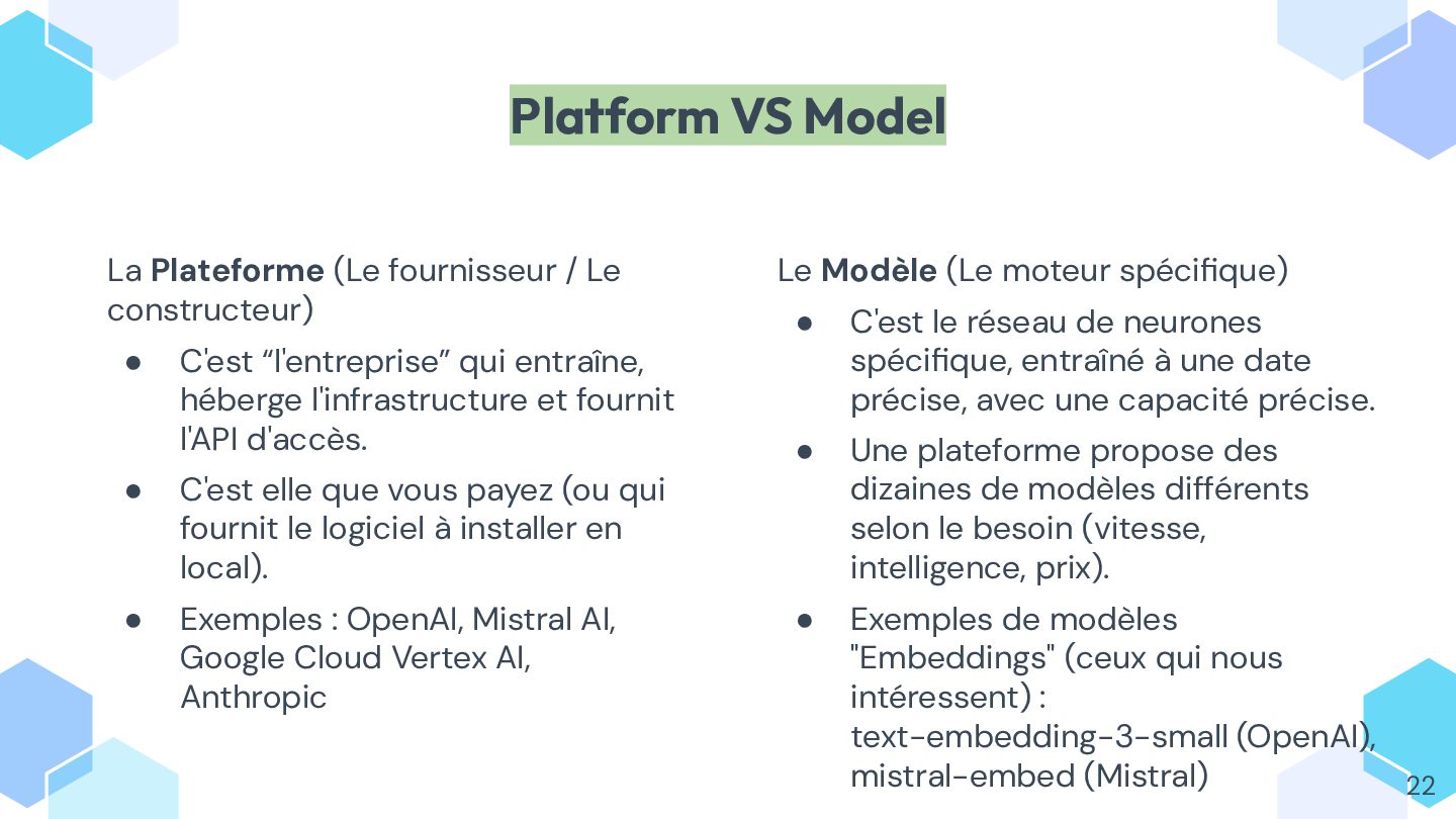 • C'est “l'entreprise” qui entraîne, héberge l'infrastructure et fournit l'API d'accès. • C'est elle que vous payez (ou qui fournit le logiciel à installer en local). • Exemples : OpenAI, Mistral AI, Google Cloud Vertex AI, Anthropic Le Modèle (Le moteur spécifique) • C'est le réseau de neurones spécifique, entraîné à une date précise, avec une capacité précise. • Une plateforme propose des dizaines de modèles différents selon le besoin (vitesse, intelligence, prix). • Exemples de modèles "Embeddings" (ceux qui nous intéressent) : text-embedding-3-small (OpenAI), mistral-embed (Mistral) 22