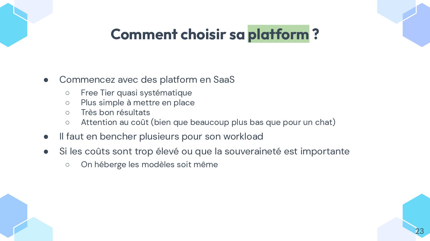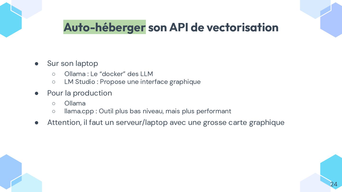 en SaaS ◦ Free Tier quasi systématique ◦ Plus simple à mettre en place ◦ Très bon résultats ◦ Attention au coût (bien que beaucoup plus bas que pour un chat) • Il faut en bencher plusieurs pour son workload • Si les coûts sont trop élevé ou que la souveraineté est importante ◦ On héberge les modèles soit même 23