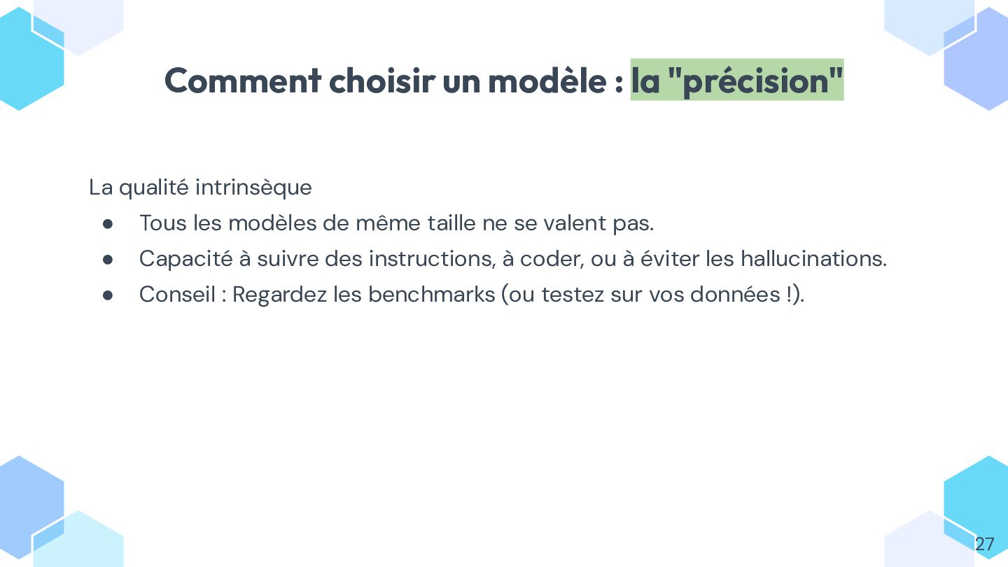 • Tous les modèles de même taille ne se valent pas. • Capacité à suivre des instructions, à coder, ou à éviter les hallucinations. • Conseil : Regardez les benchmarks (ou testez sur vos données !). 27