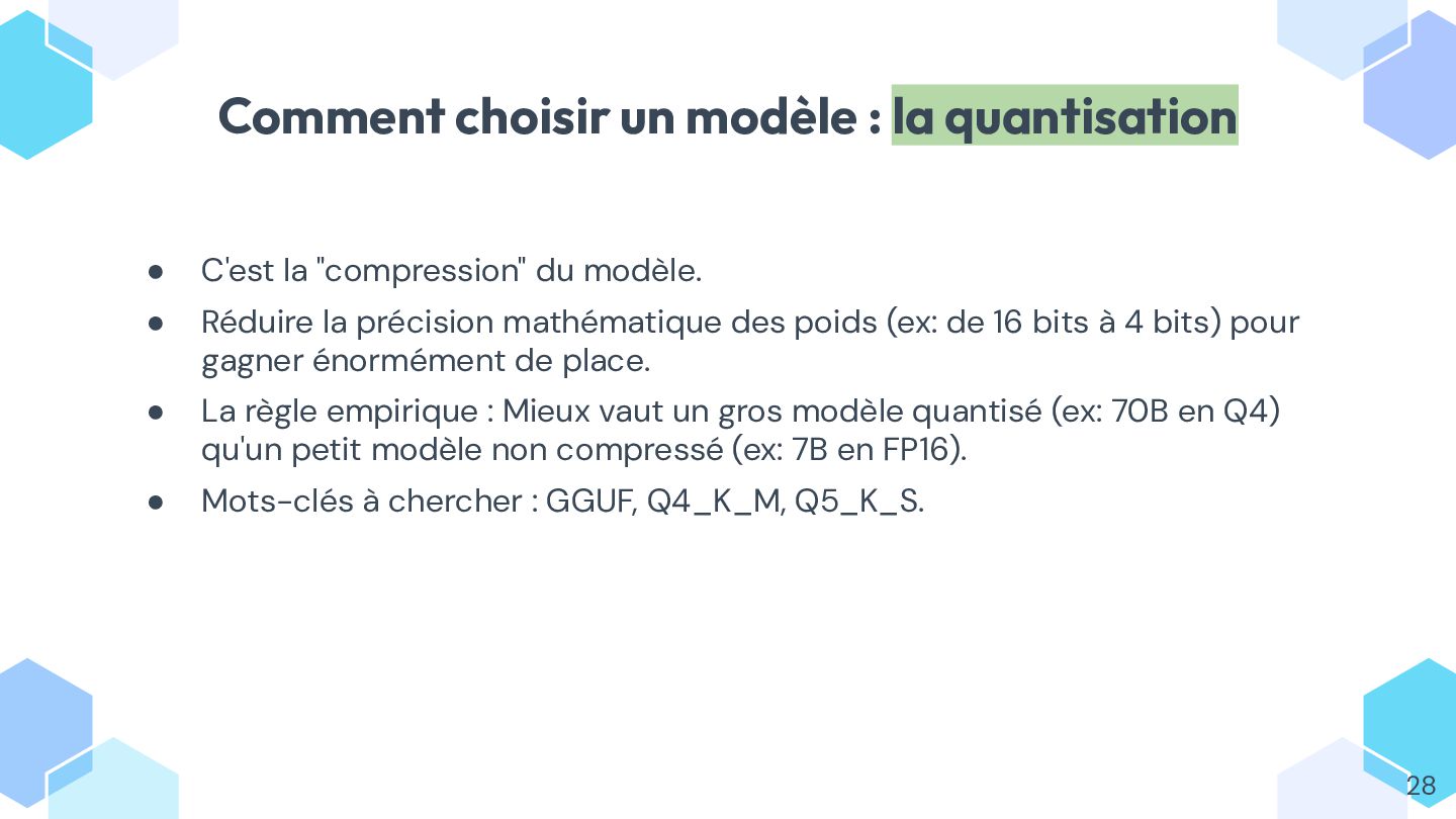 "compression" du modèle. • Réduire la précision mathématique des poids (ex: de 16 bits à 4 bits) pour gagner énormément de place. • La règle empirique : Mieux vaut un gros modèle quantisé (ex: 70B en Q4) qu'un petit modèle non compressé (ex: 7B en FP16). • Mots-clés à chercher : GGUF, Q4_K_M, Q5_K_S. 28