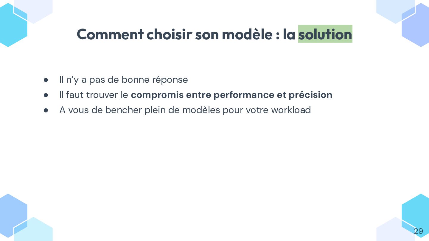 a pas de bonne réponse • Il faut trouver le compromis entre performance et précision • A vous de bencher plein de modèles pour votre workload 29