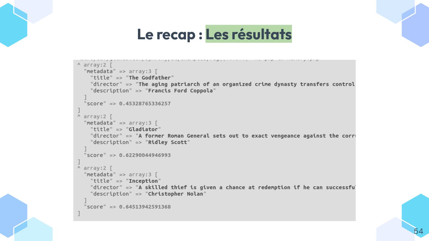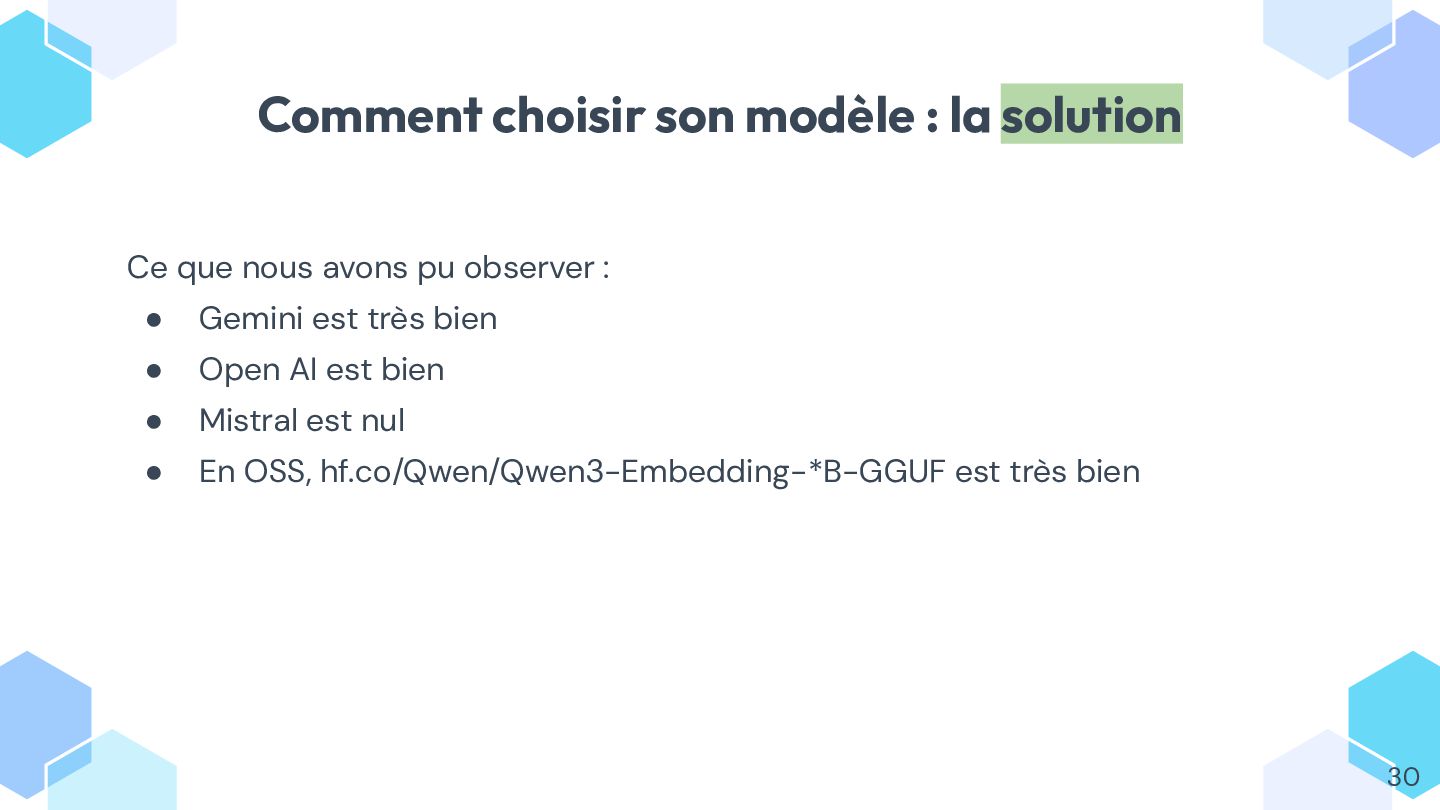 avons pu observer : • Gemini est très bien • Open AI est bien • Mistral est nul • En OSS, hf.co/Qwen/Qwen3-Embedding-*B-GGUF est très bien 30