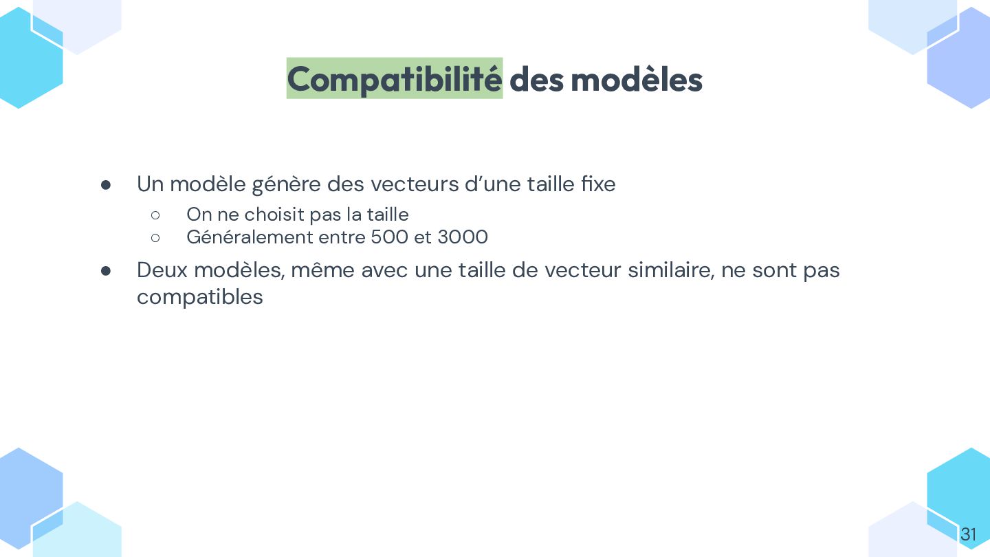 taille fixe ◦ On ne choisit pas la taille ◦ Généralement entre 500 et 3000 • Deux modèles, même avec une taille de vecteur similaire, ne sont pas compatibles 31