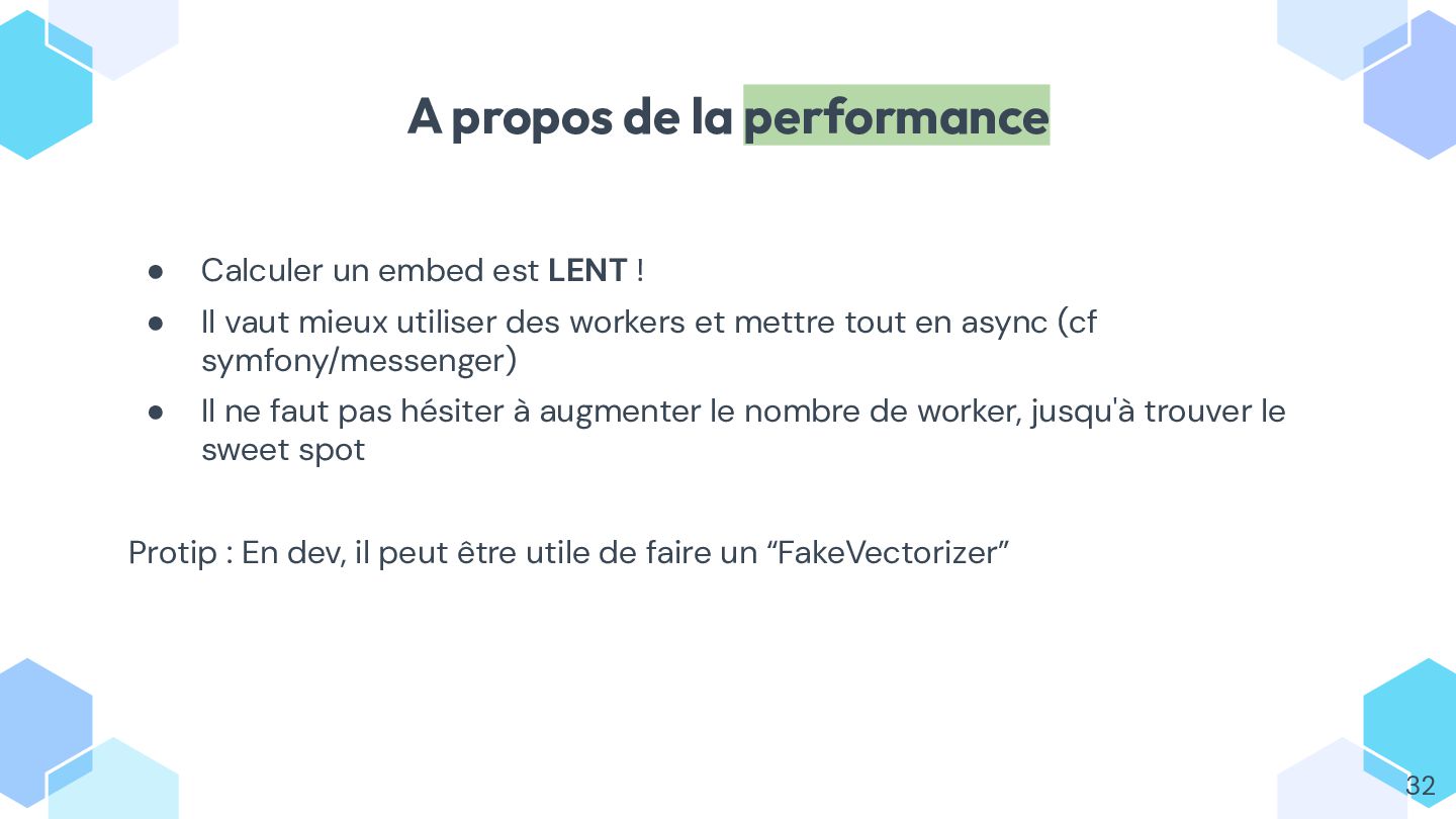 LENT ! • Il vaut mieux utiliser des workers et mettre tout en async (cf symfony/messenger) • Il ne faut pas hésiter à augmenter le nombre de worker, jusqu'à trouver le sweet spot Protip : En dev, il peut être utile de faire un “FakeVectorizer” 32