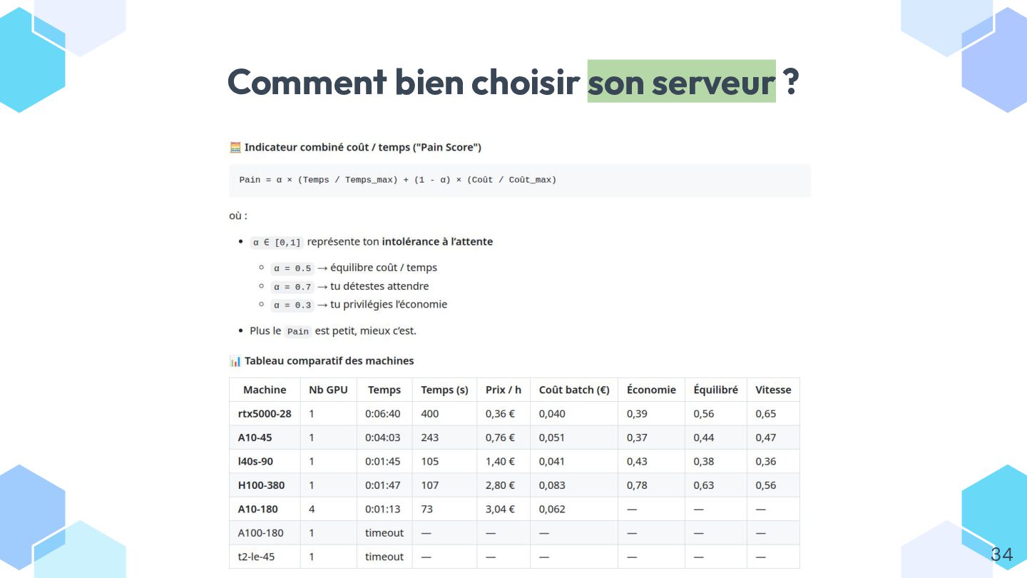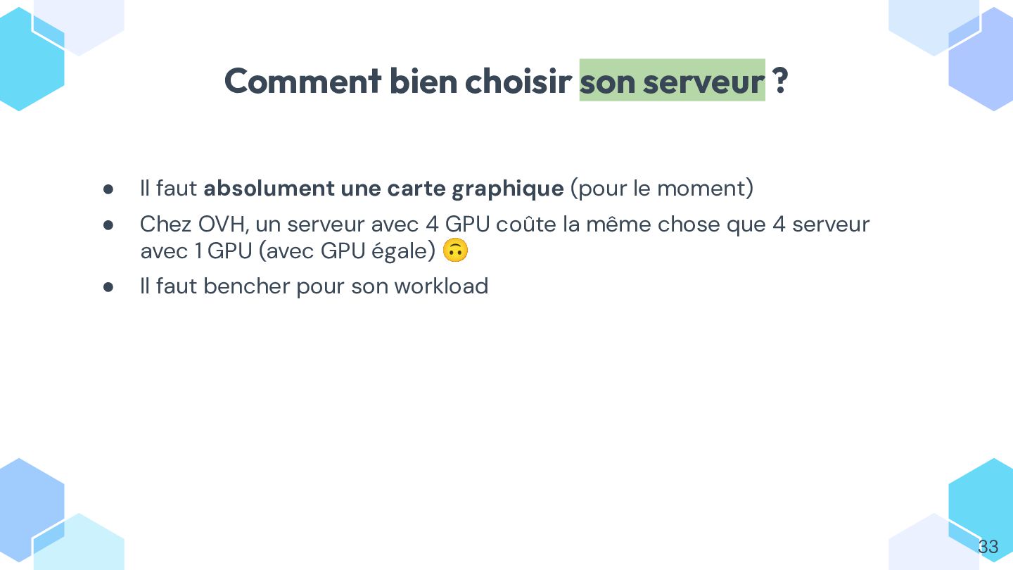 une carte graphique (pour le moment) • Chez OVH, un serveur avec 4 GPU coûte la même chose que 4 serveur avec 1 GPU (avec GPU égale) 🙃 • Il faut bencher pour son workload 33
