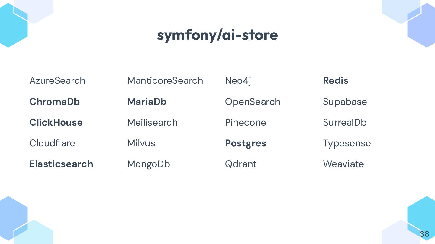 30. symfony/ai-store AzureSearch ChromaDb ClickHouse Cloudflare Elasticsearch ManticoreSearch MariaDb Meilisearch Milvus