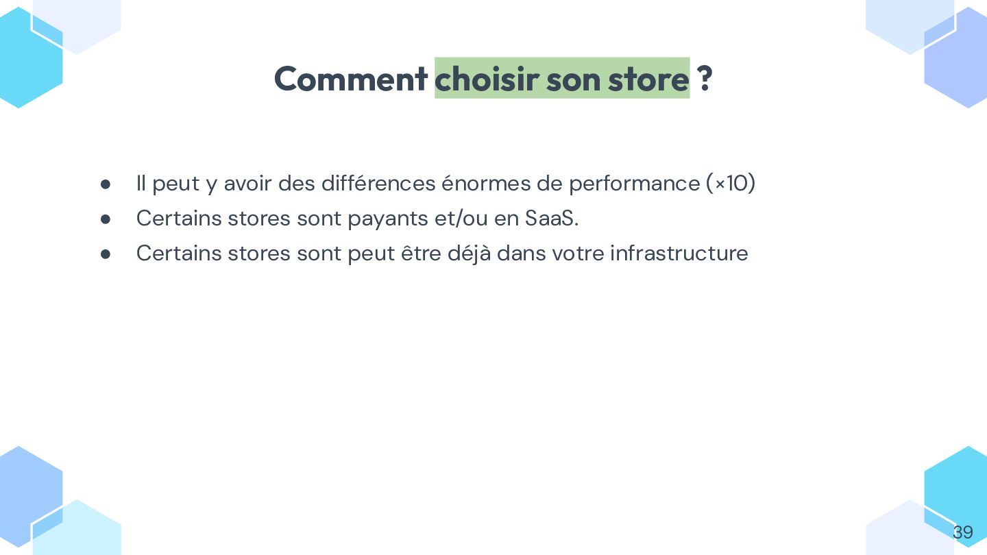 des différences énormes de performance (×10) • Certains stores sont payants et/ou en SaaS. • Certains stores sont peut être déjà dans votre infrastructure 39