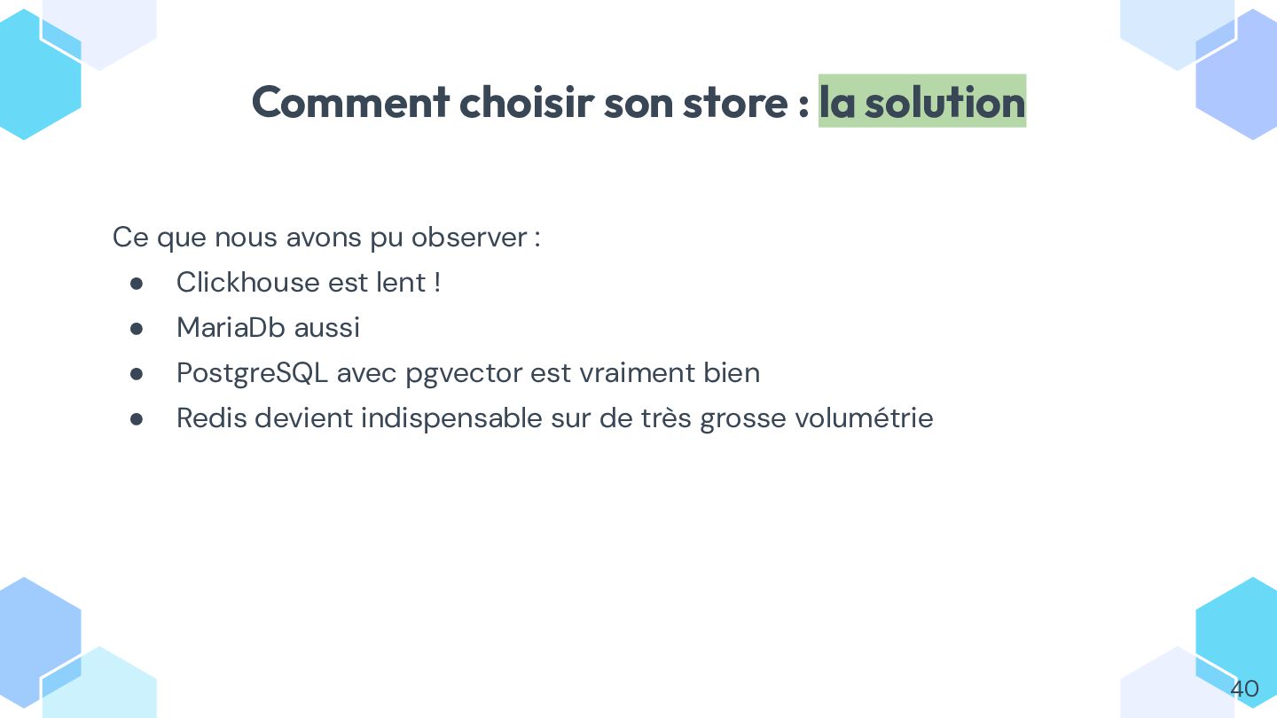 avons pu observer : • Clickhouse est lent ! • MariaDb aussi • PostgreSQL avec pgvector est vraiment bien • Redis devient indispensable sur de très grosse volumétrie 40