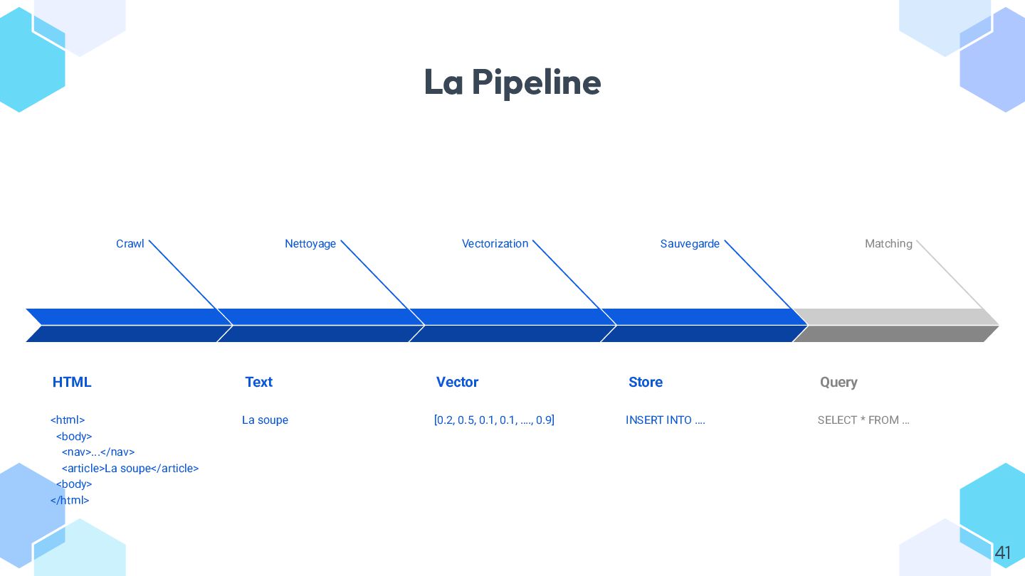 </html> Nettoyage Text La soupe Vectorization Vector [0.2, 0.5, 0.1, 0.1, …., 0.9] Sauvegarde Store INSERT INTO …. 41 Matching Query SELECT * FROM …