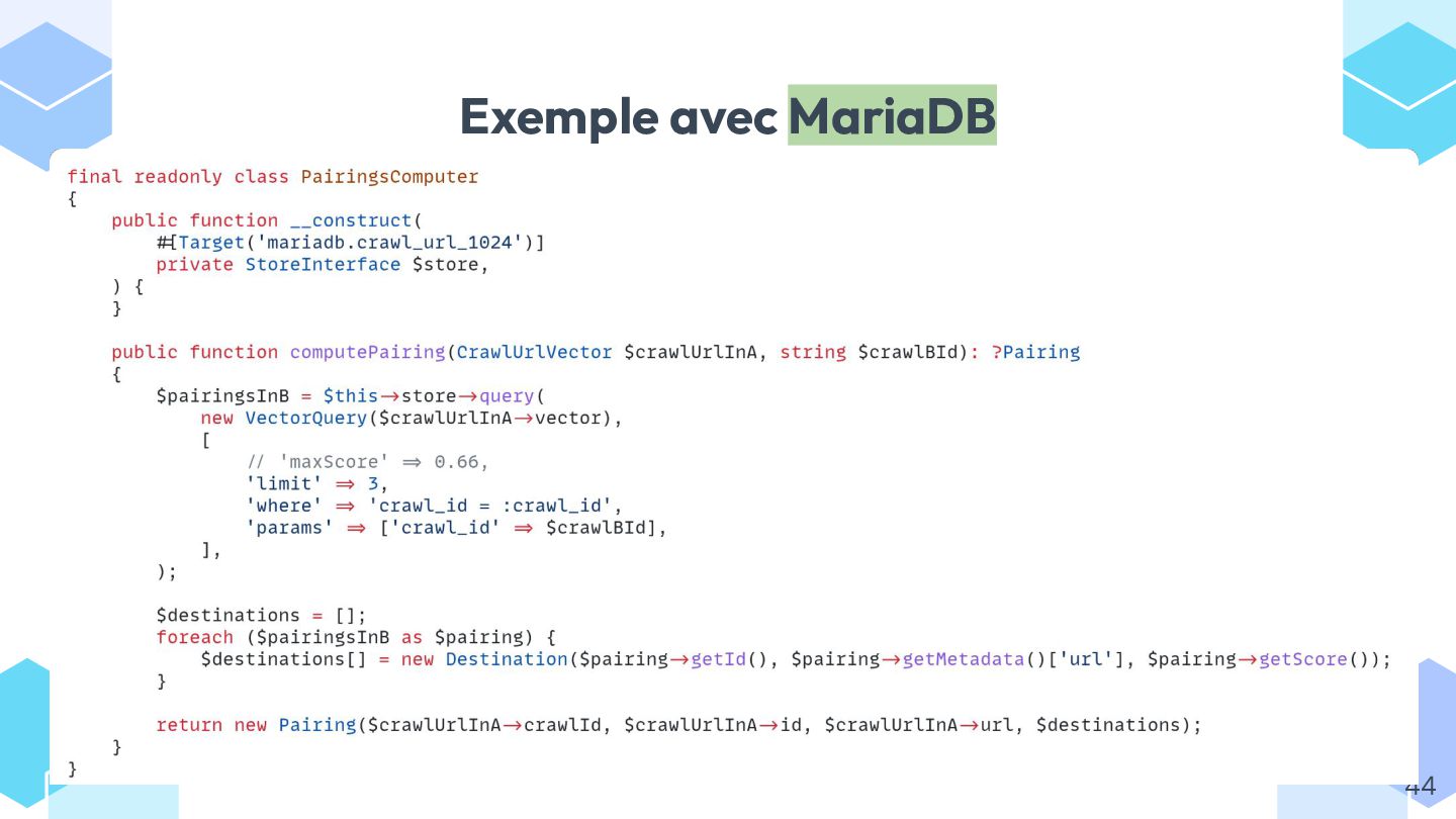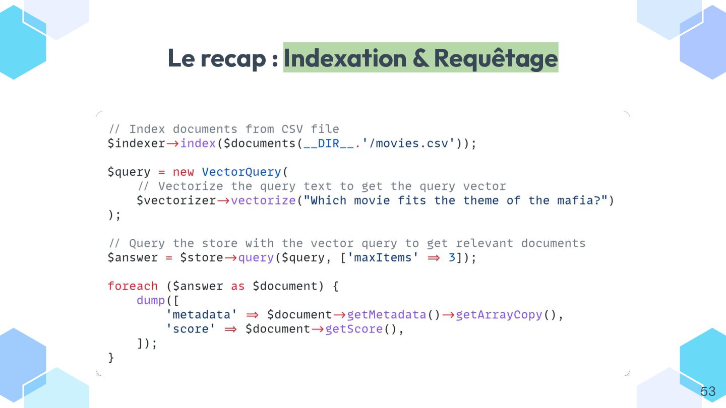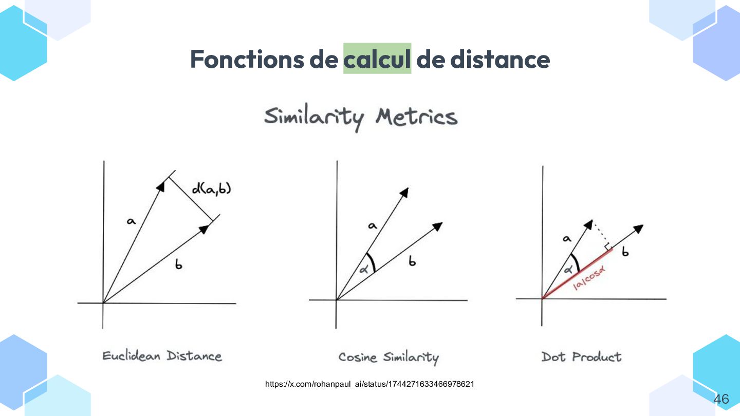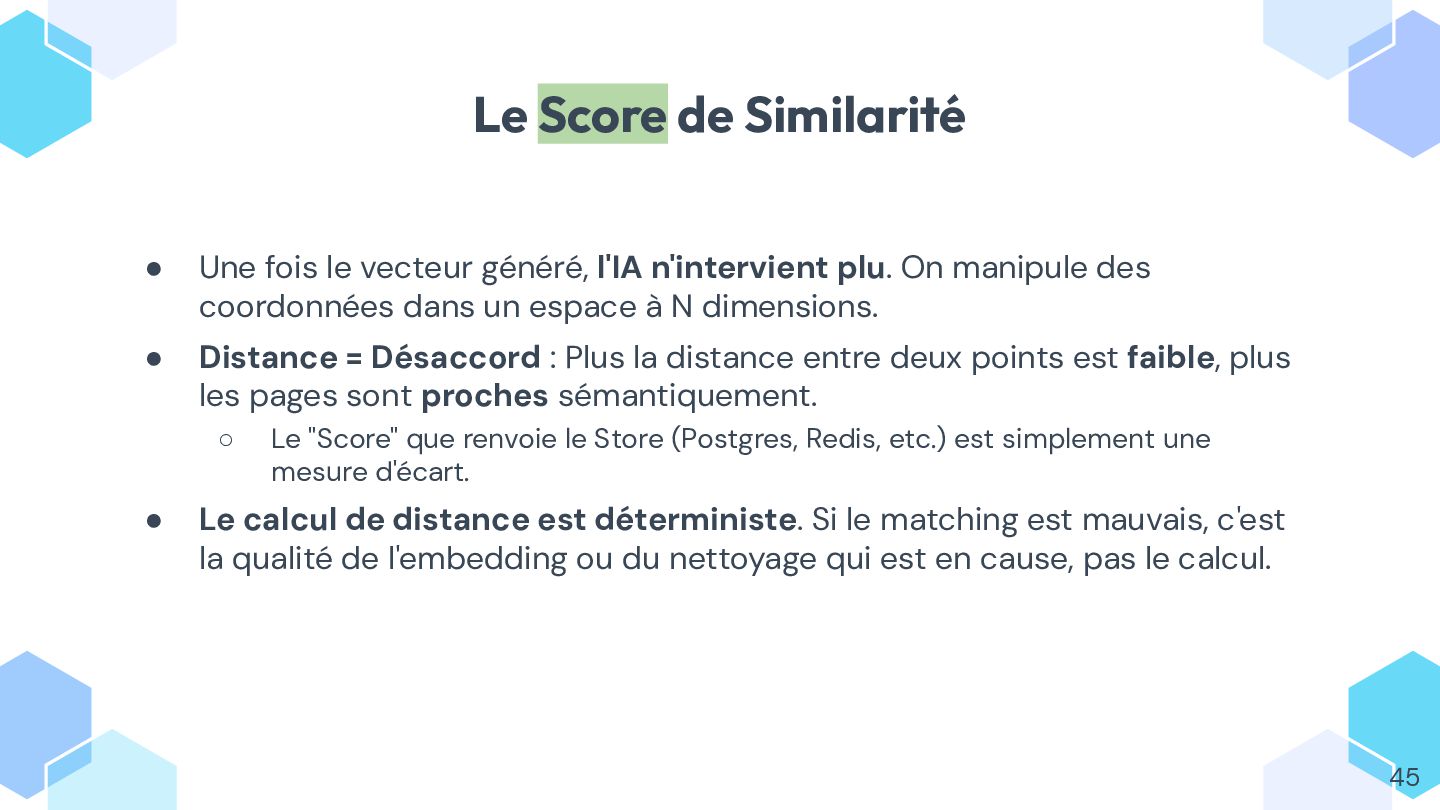 l'IA n'intervient plu. On manipule des coordonnées dans un espace à N dimensions. • Distance = Désaccord : Plus la distance entre deux points est faible, plus les pages sont proches sémantiquement. ◦ Le "Score" que renvoie le Store (Postgres, Redis, etc.) est simplement une mesure d'écart. • Le calcul de distance est déterministe. Si le matching est mauvais, c'est la qualité de l'embedding ou du nettoyage qui est en cause, pas le calcul. 45