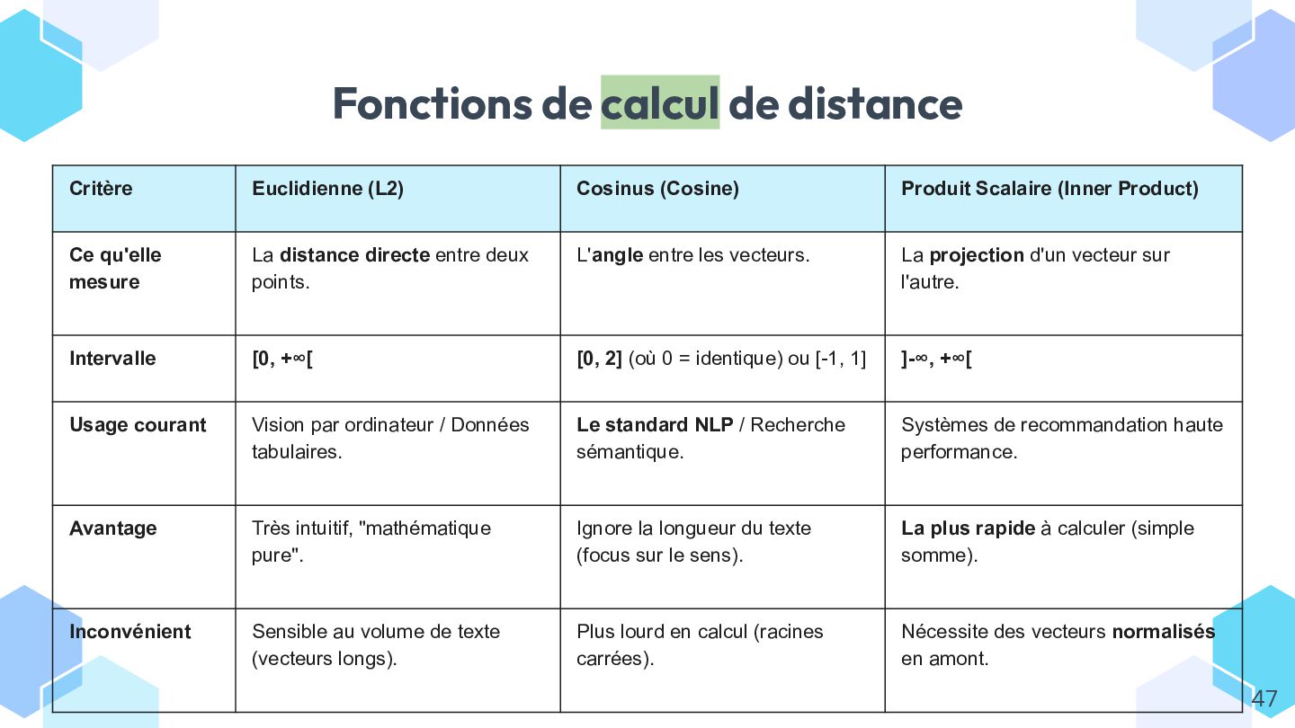 (Cosine) Produit Scalaire (Inner Product) Ce qu'elle mesure La distance directe entre deux points. L'angle entre les vecteurs. La projection d'un vecteur sur l'autre. Intervalle [0, +∞[ [0, 2] (où 0 = identique) ou [-1, 1] ]-∞, +∞[ Usage courant Vision par ordinateur / Données tabulaires. Le standard NLP / Recherche sémantique. Systèmes de recommandation haute performance. Avantage Très intuitif, "mathématique pure". Ignore la longueur du texte (focus sur le sens). La plus rapide à calculer (simple somme). Inconvénient Sensible au volume de texte (vecteurs longs). Plus lourd en calcul (racines carrées). Nécessite des vecteurs normalisés en amont.