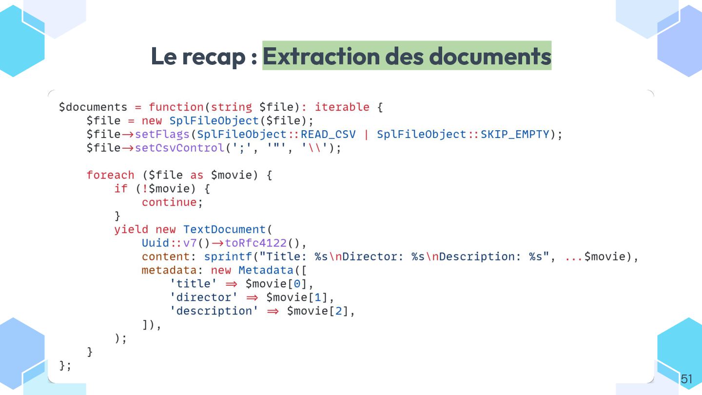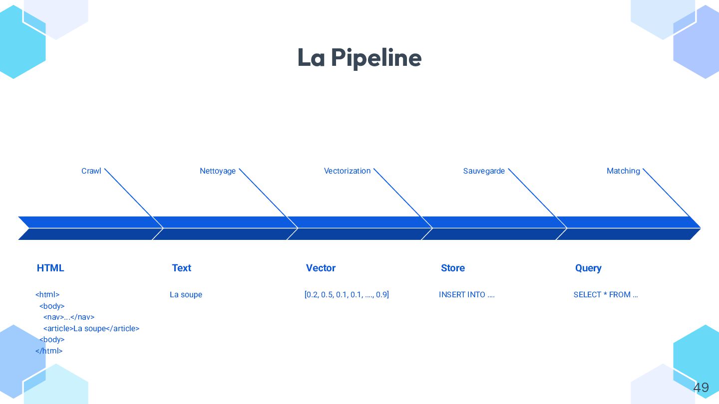 </html> Nettoyage Text La soupe Vectorization Vector [0.2, 0.5, 0.1, 0.1, …., 0.9] Sauvegarde Store INSERT INTO …. 49 Matching Query SELECT * FROM …