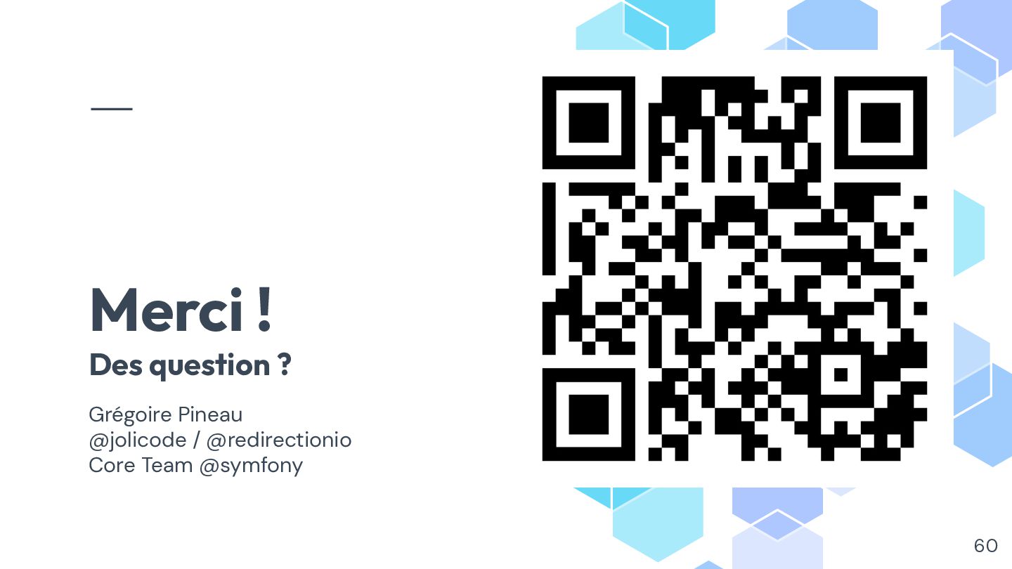 platform / différents modèles • Il faut tester différents store • symfony/ai simplifie énormément le travail grâce à ses abstractions : ◦ Store ◦ Platform ◦ Il existe d’autres composants ▪ Agent ▪ Chat ▪ Mate ▪ Mcp 59