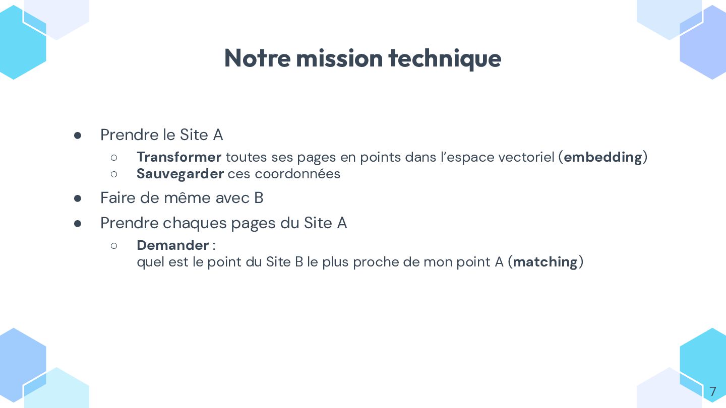 toutes ses pages en points dans l’espace vectoriel (embedding) ◦ Sauvegarder ces coordonnées • Faire de même avec B • Prendre chaques pages du Site A ◦ Demander : quel est le point du Site B le plus proche de mon point A (matching) 7